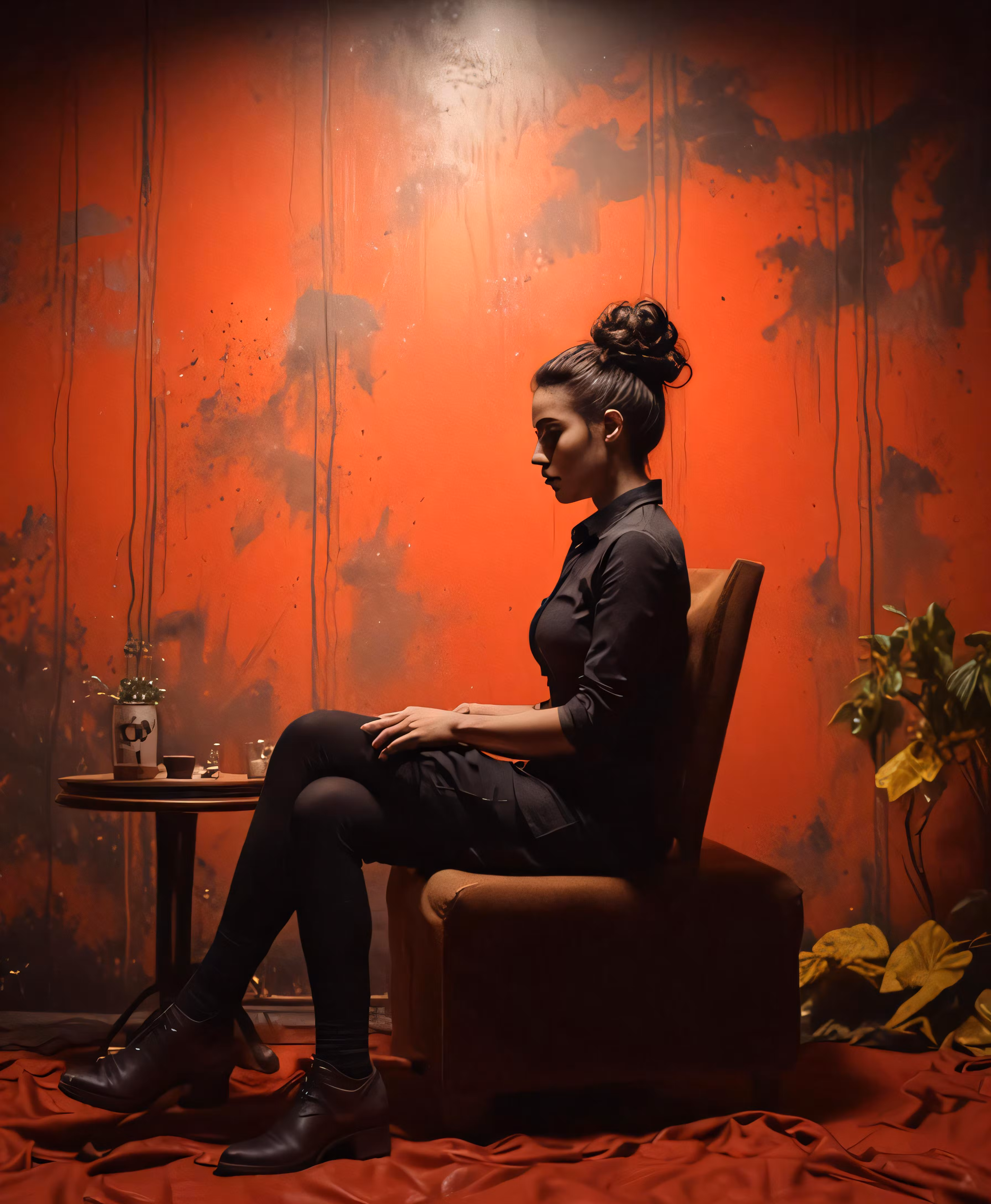 High resolution picture, free to use, the official logo for the 50 /a woman sitting in a chair in front of a red wall