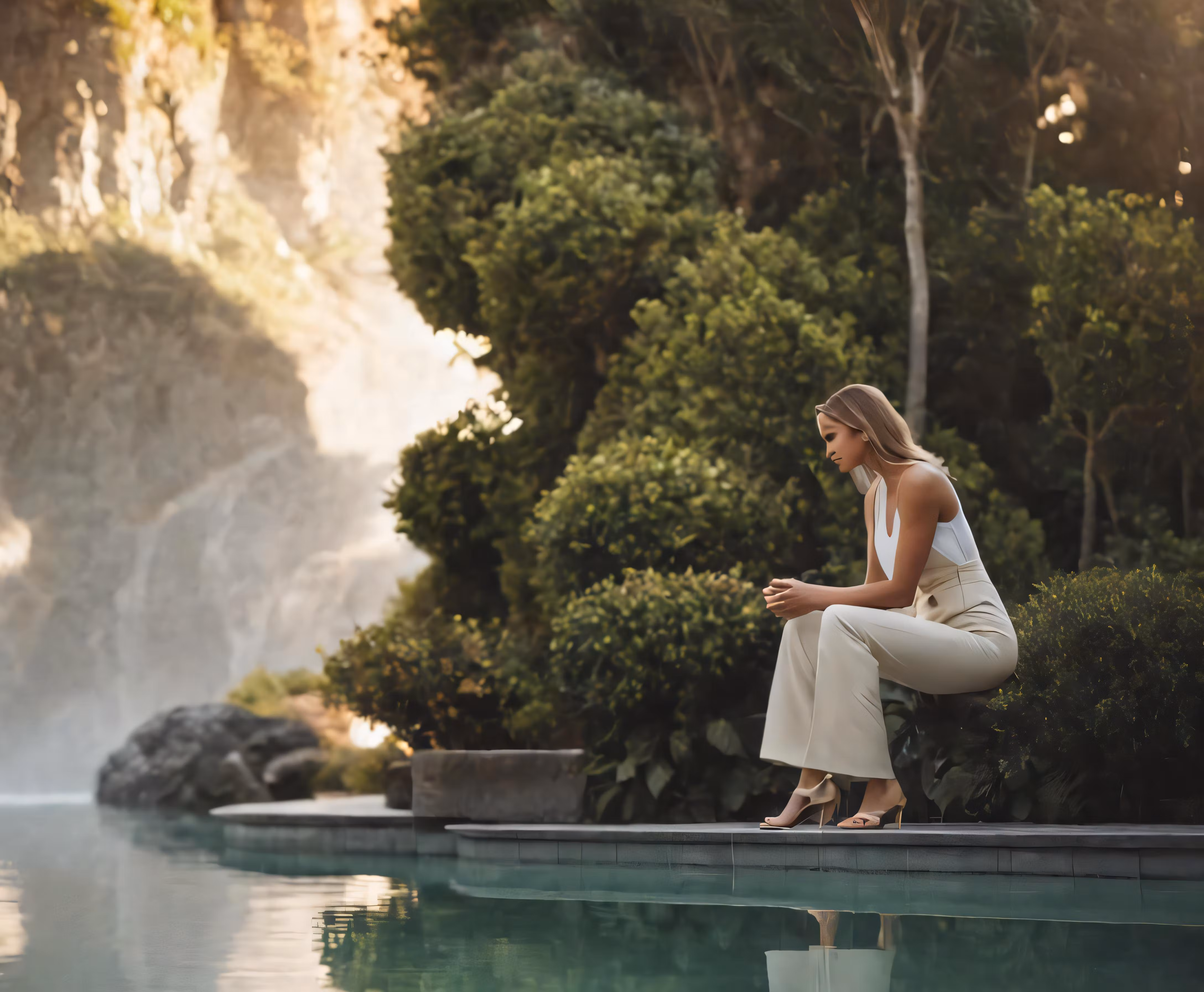 High resolution picture, free to use, the official logo for the 50 /a woman sitting on the edge of a pool with her feet on the edge of the pool