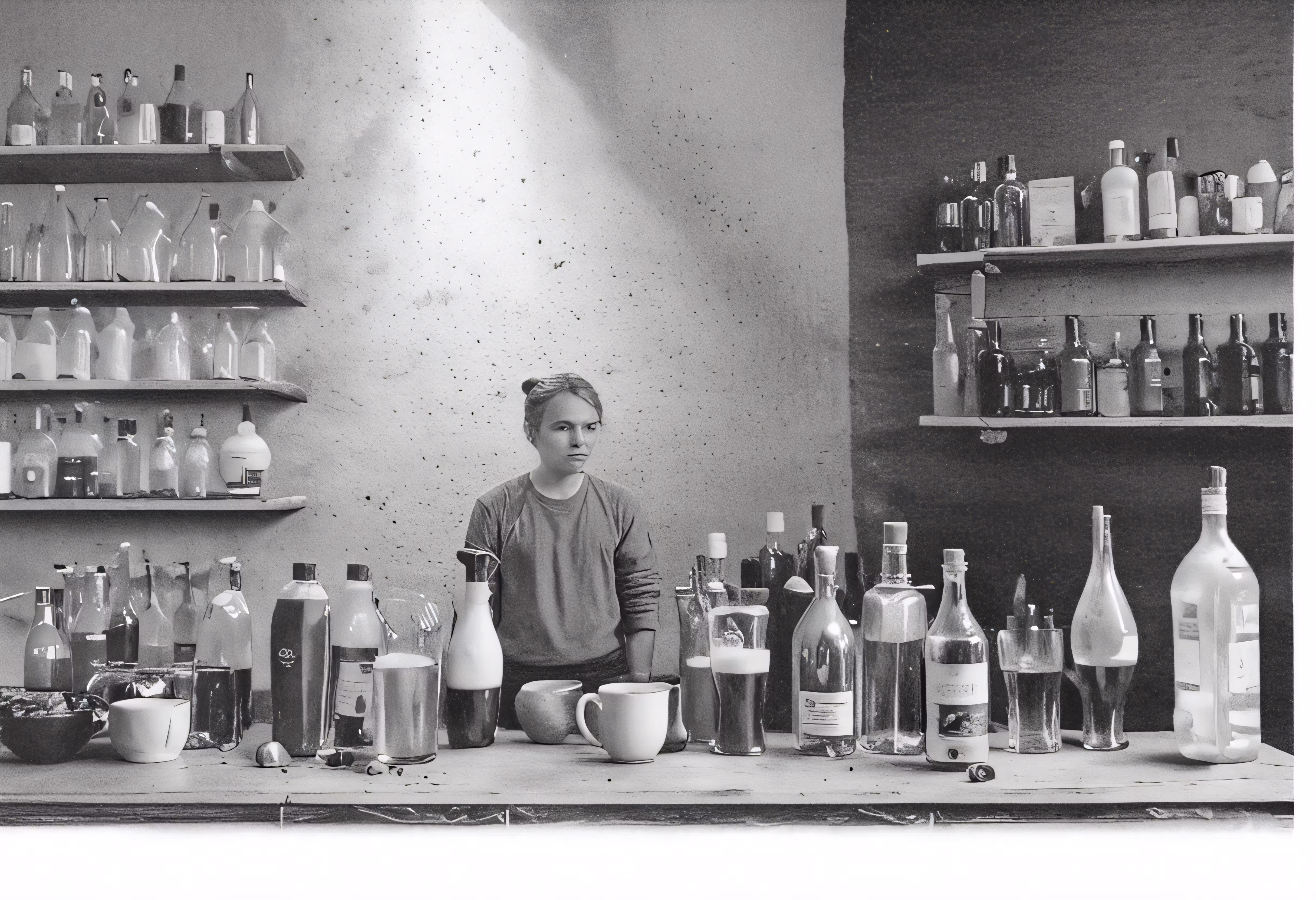 High resolution picture, free to use, the official logo for the 50 /a woman standing at a counter surrounded by bottles