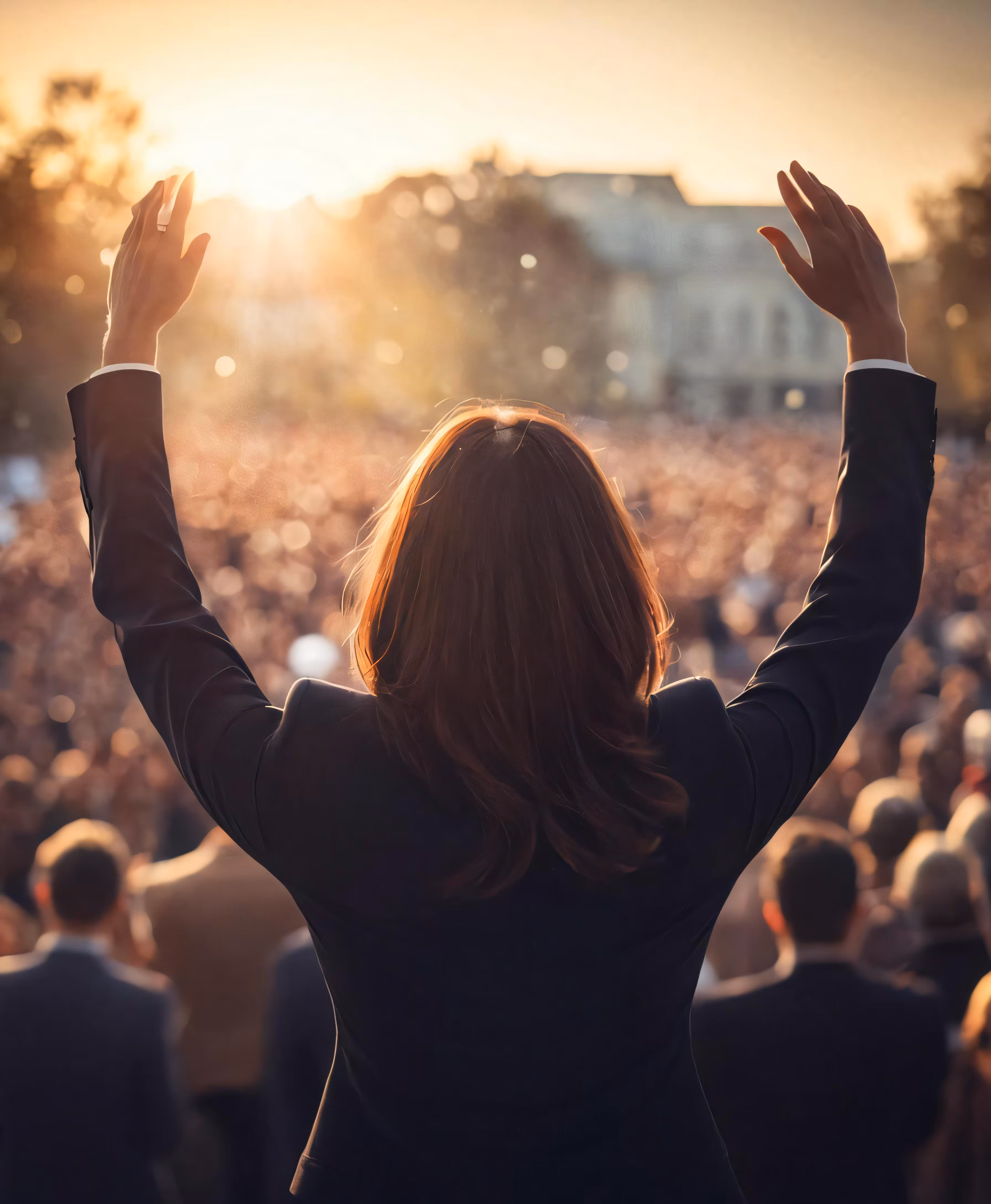 High resolution picture, free to use, the official logo for the 50 /a woman standing on top of a crowd next to a sun