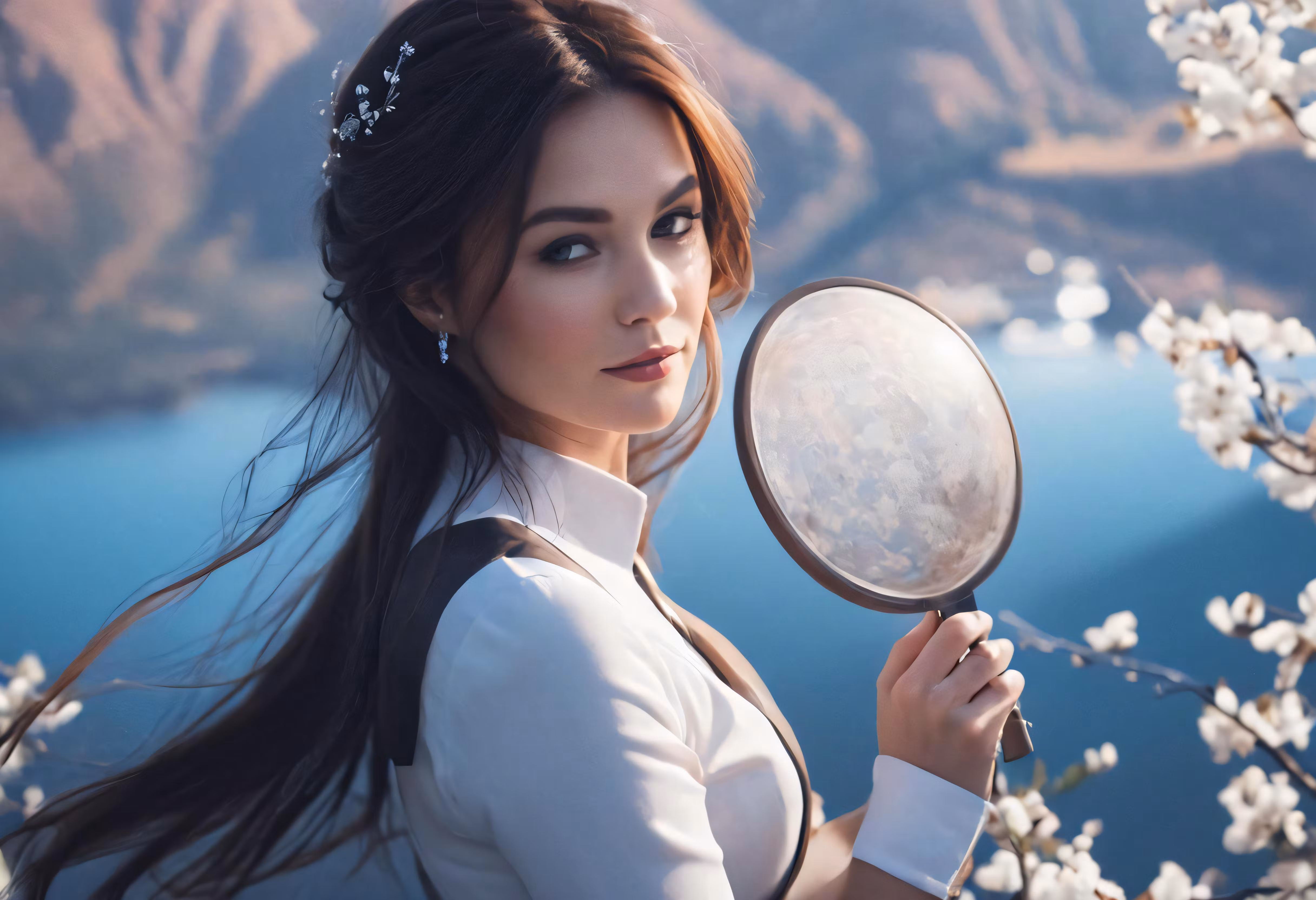 High resolution picture, free to use, the official logo for the 50 /a woman standing under a tree holding a magnifying glass