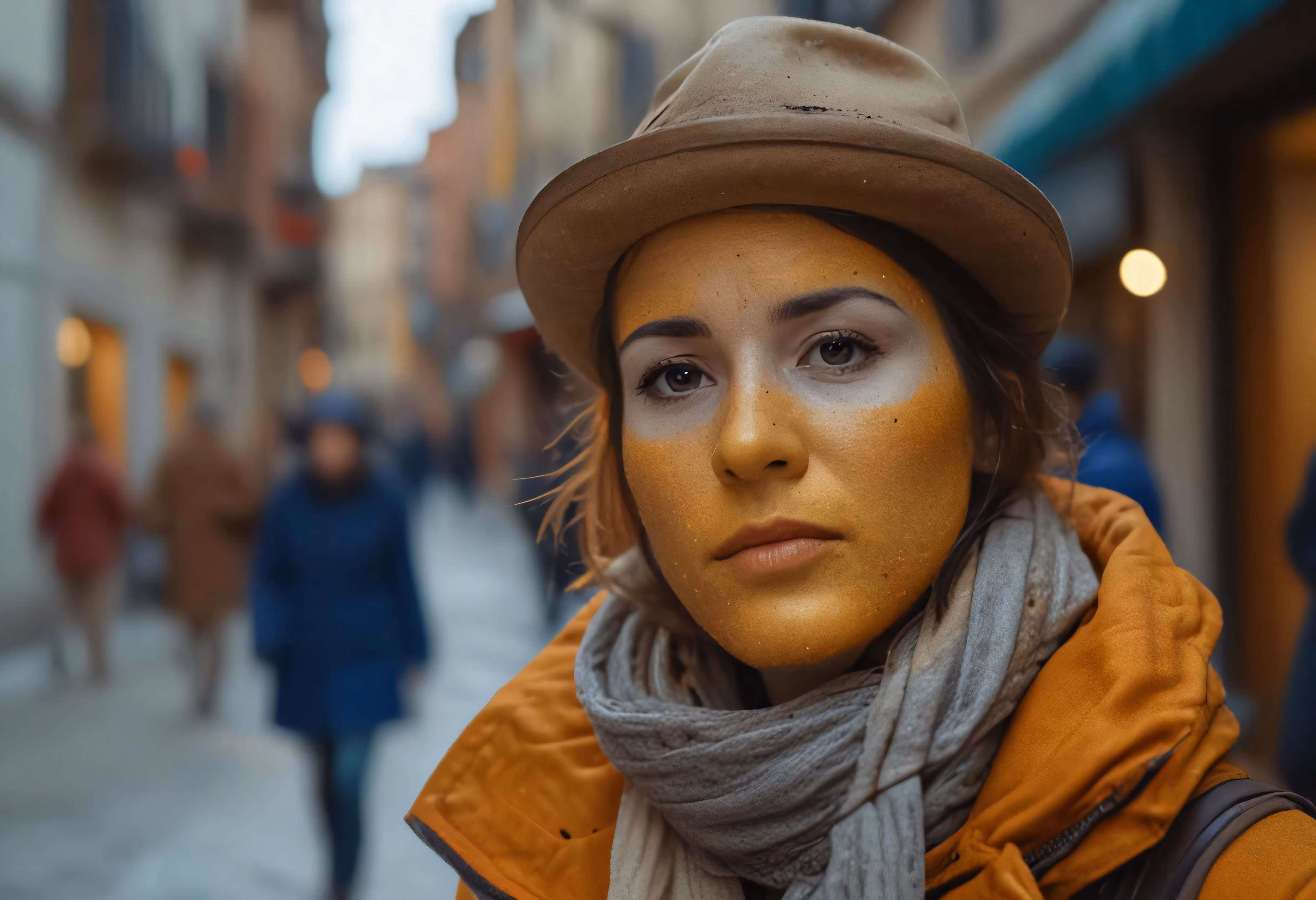 High resolution picture, free to use, the official logo for the 50 /a woman wearing a brown hat and scarf and tan coat
