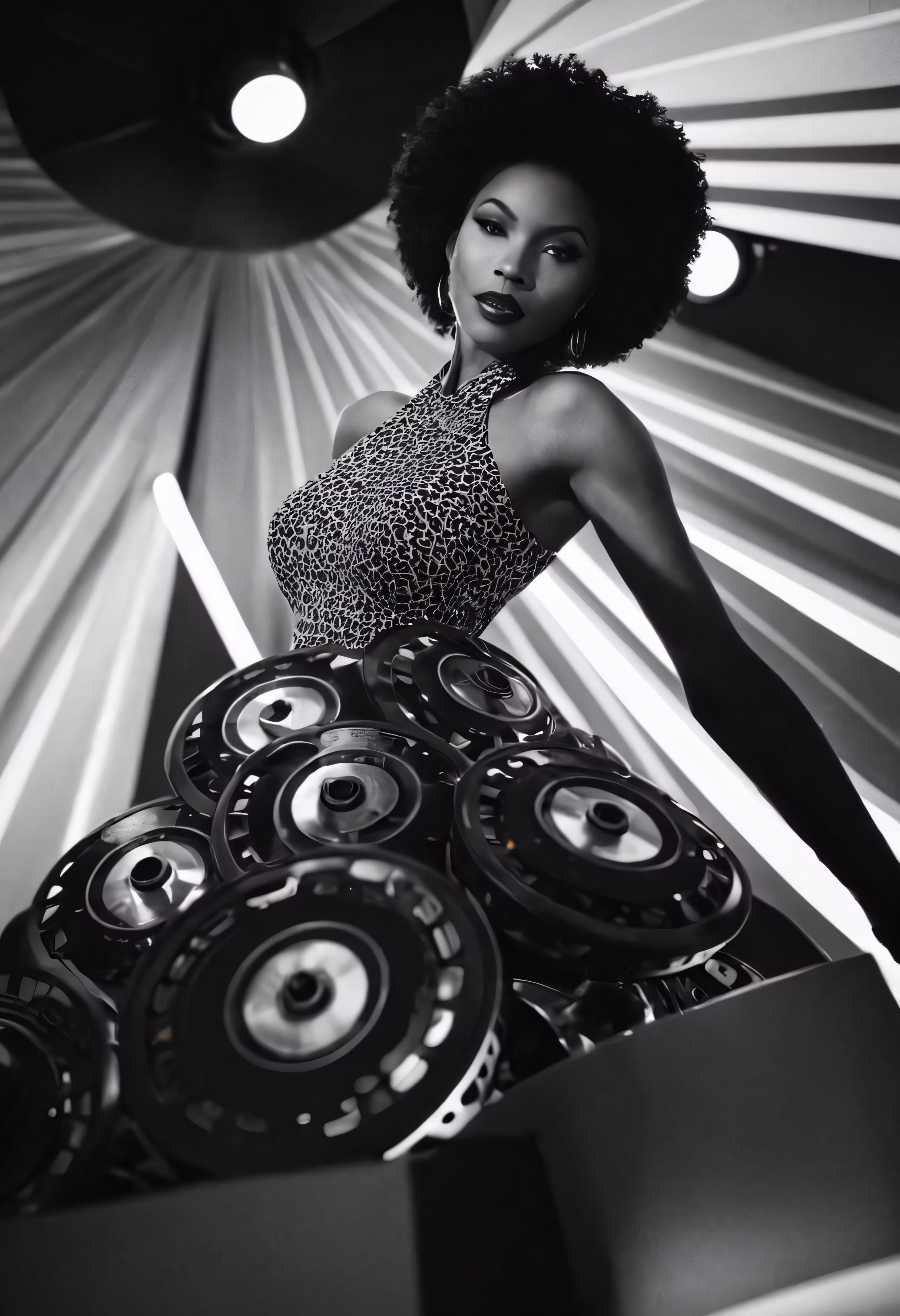 High resolution picture, free to use, the official logo for the 50 /a woman wearing a dress with speakers around her