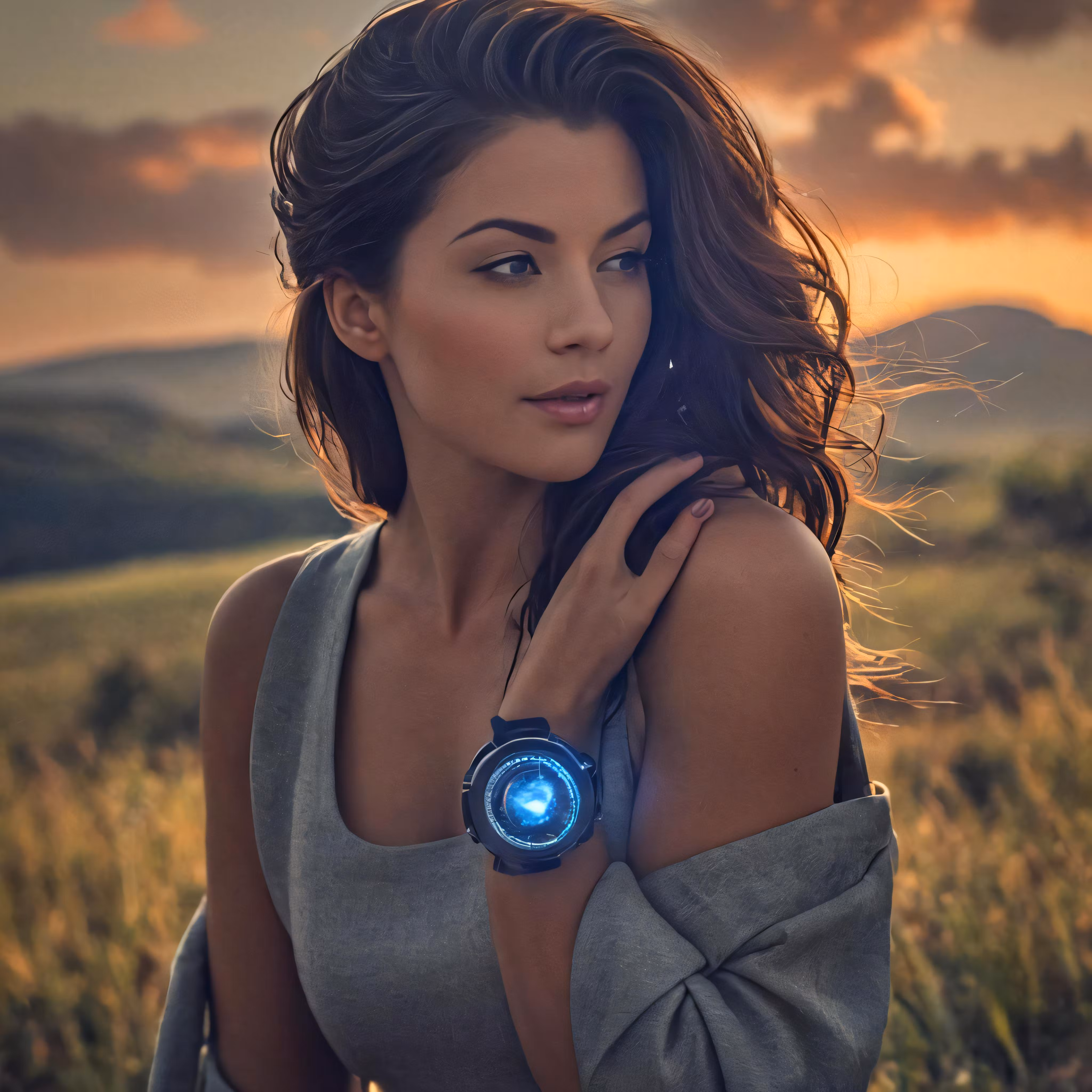 High resolution picture, free to use, the official logo for the 50 /a woman wearing a glowing wristwatch with blue light