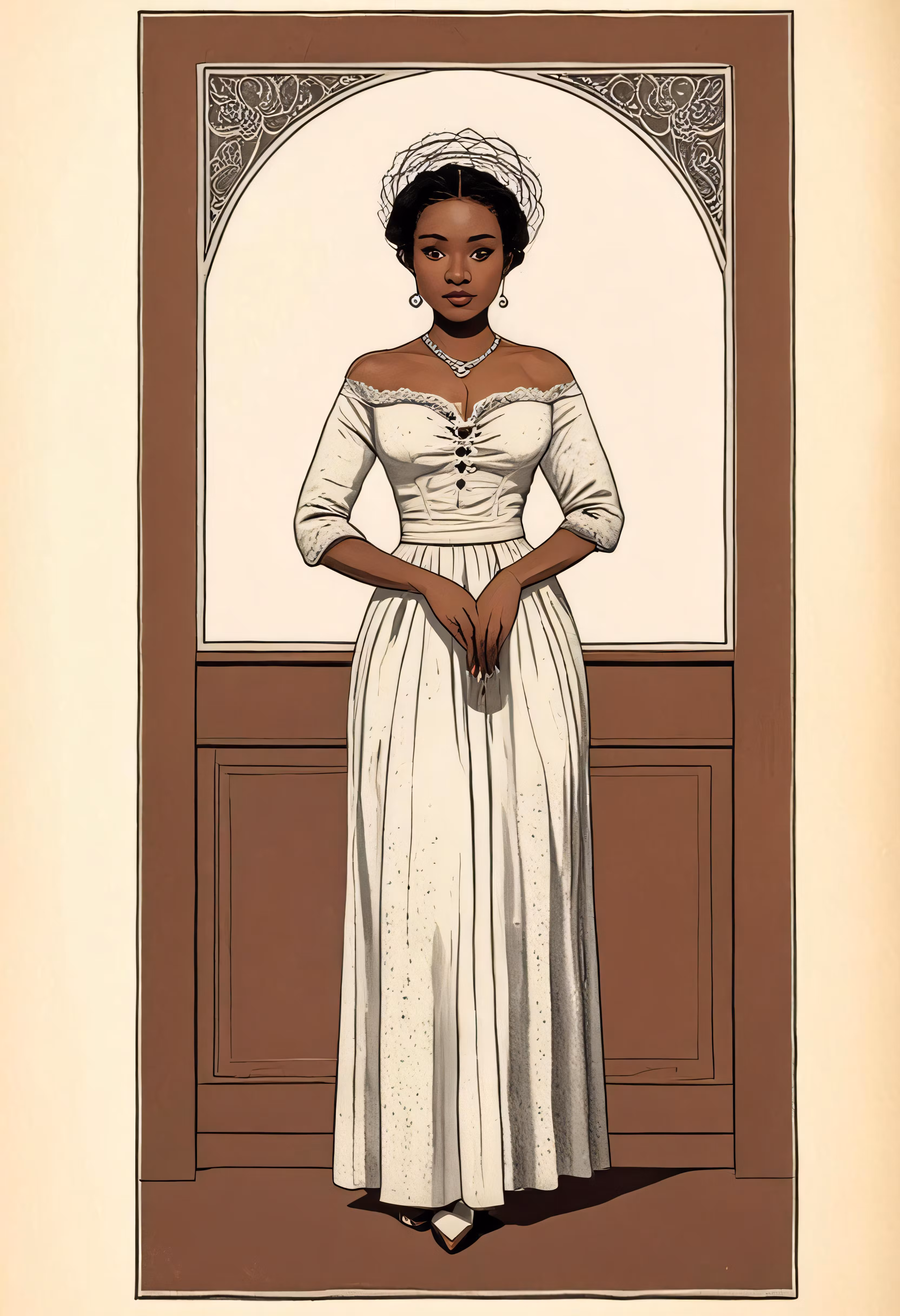 High resolution picture, free to use, the official logo for the 50 /a woman wearing a white dress stands in front of a doorway