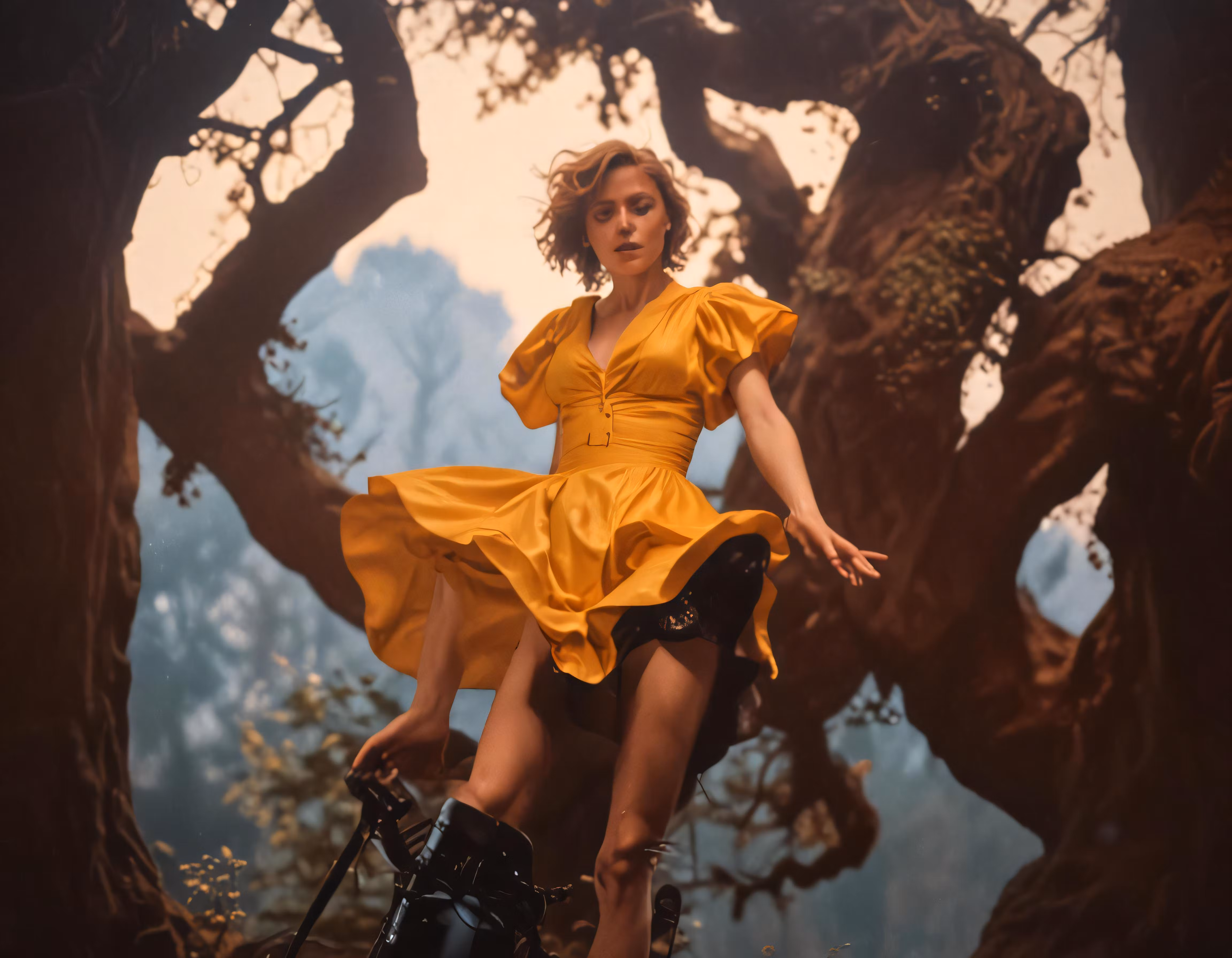 High resolution picture, free to use, the official logo for the 50 /a young woman in yellow dresses, and black high boots is posed in a tree