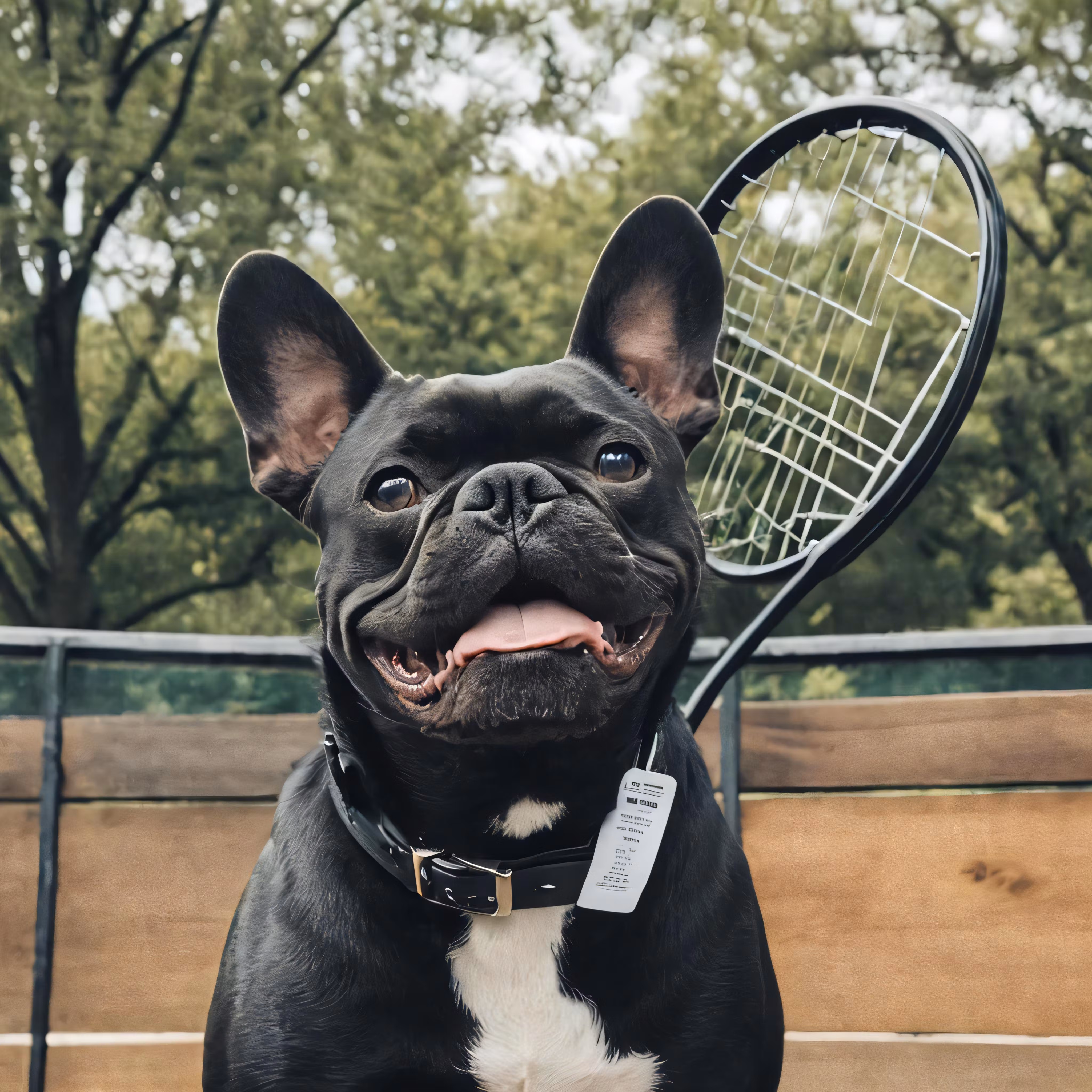 High resolution picture, free to use, the official logo for the 50 /an adorable black french bulldog holding a tennis racket
