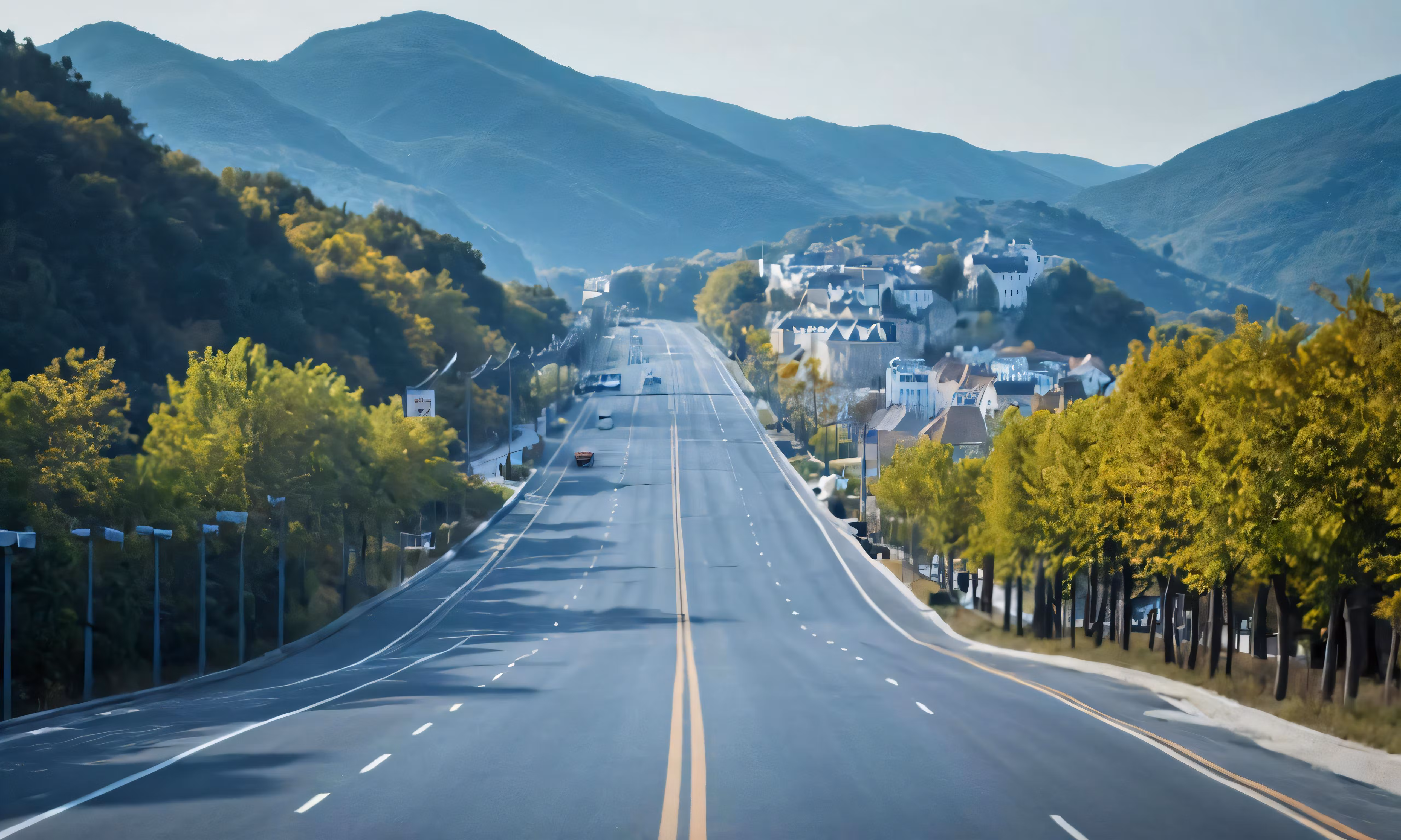 High resolution picture, free to use, the official logo for the 50 /an empty street leading to a city on the mountains