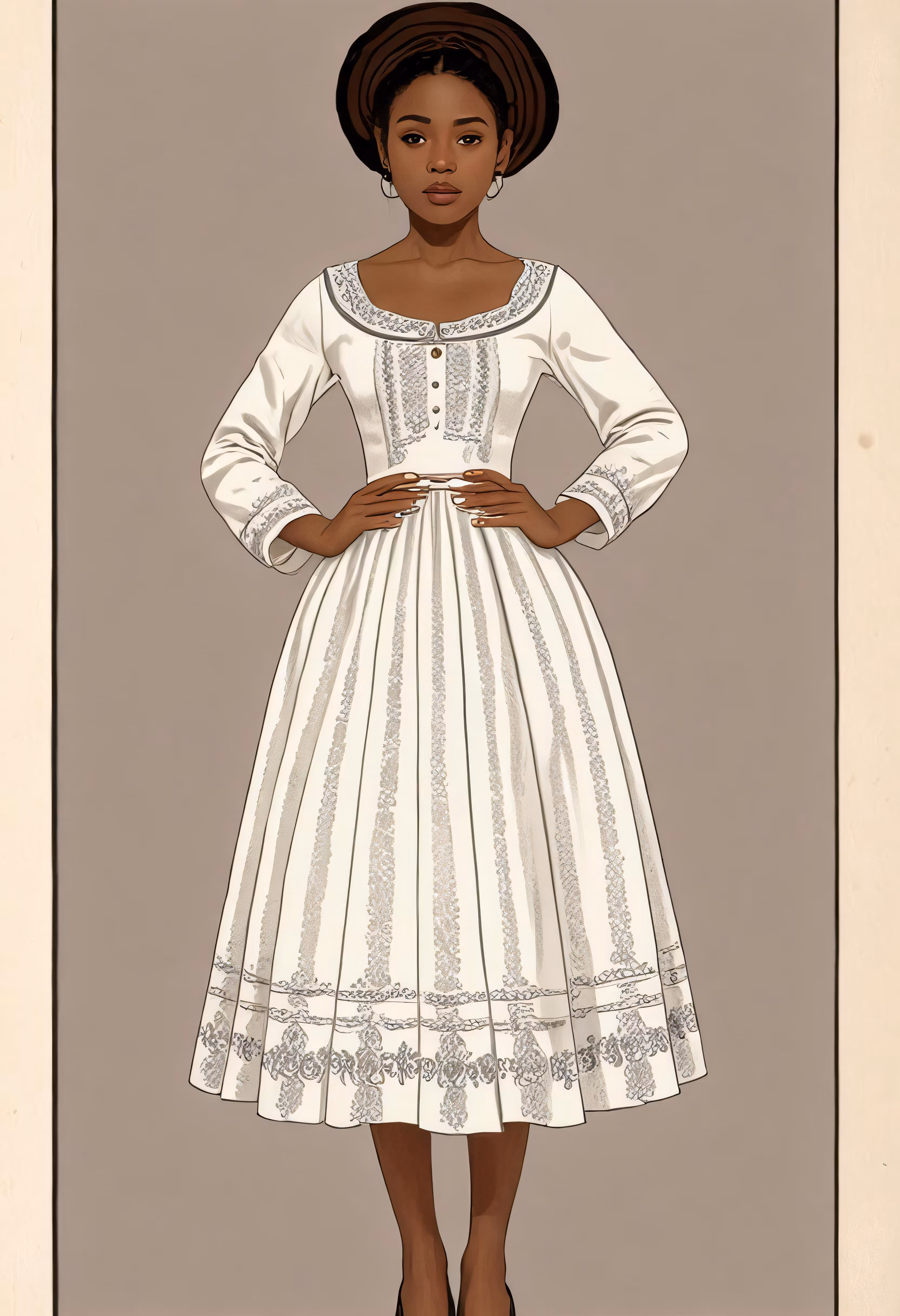 High resolution picture, free to use, the official logo for the 50 /an illustrated of a woman wearing a white dress with black hair and a brown hat