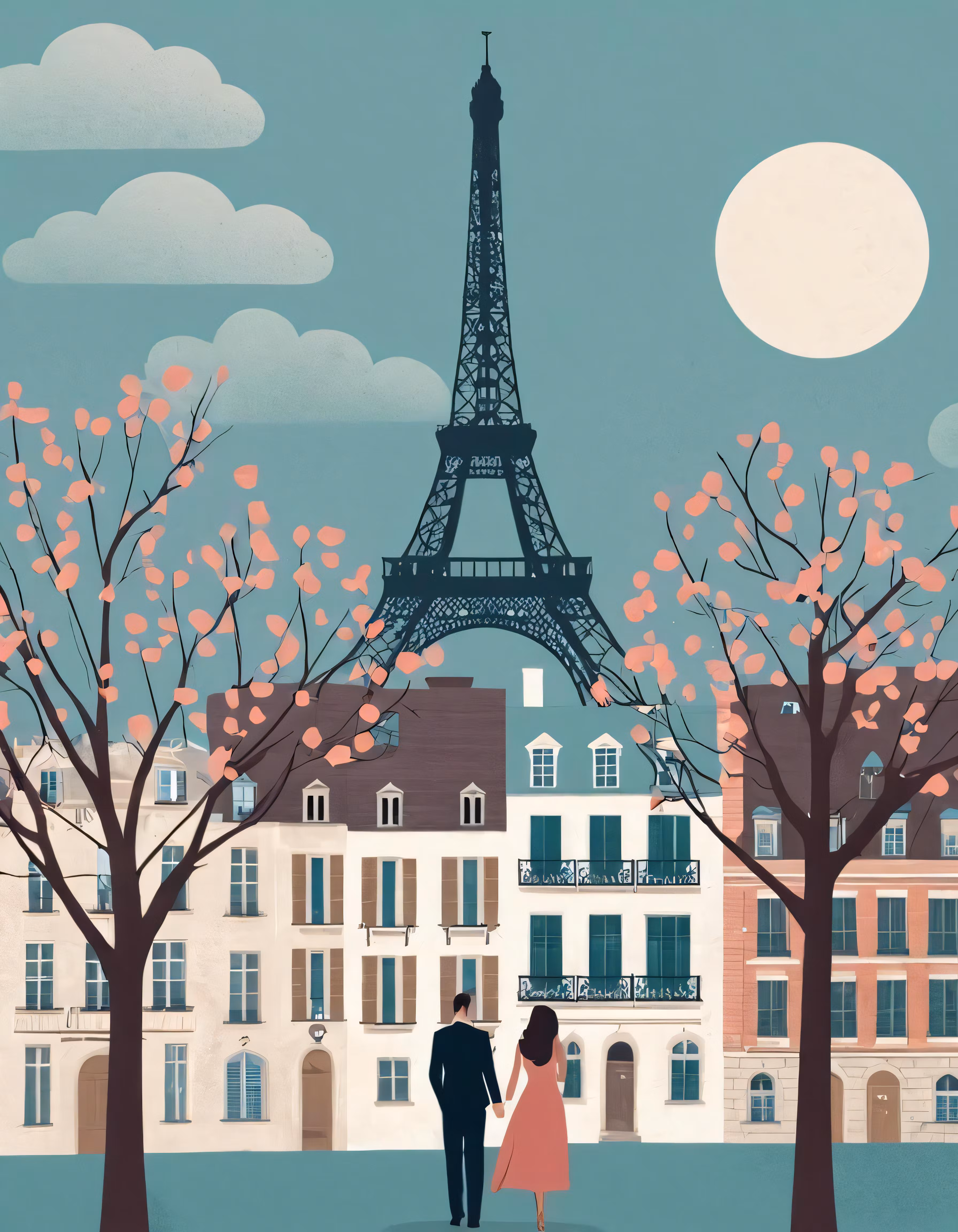 High resolution picture, free to use, the official logo for the 50 /an illustration of people walking on the pavement towards the eiffel tower
