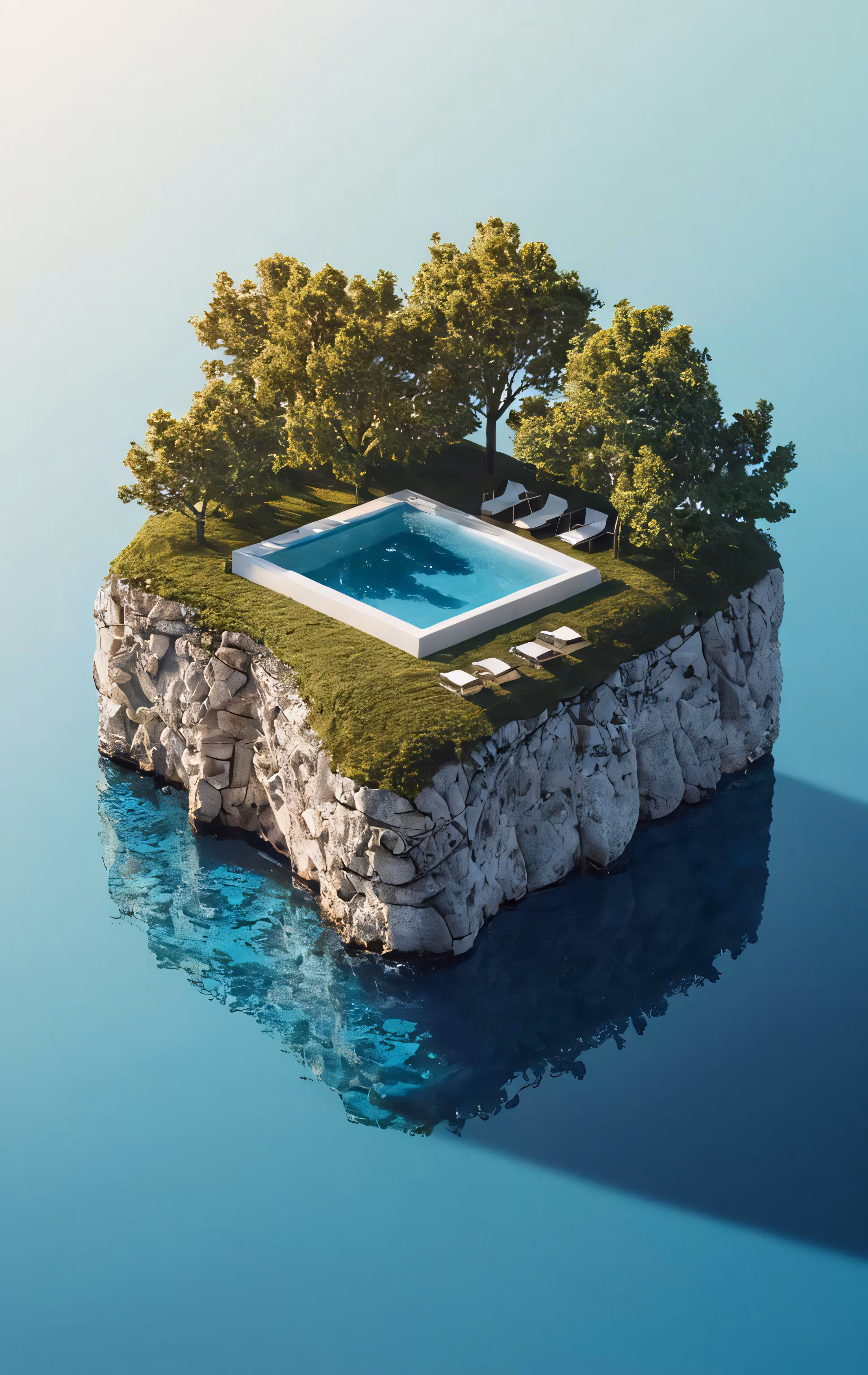 High resolution picture, free to use, the official logo for the 50 /an island is surrounded by a swimming pool and trees