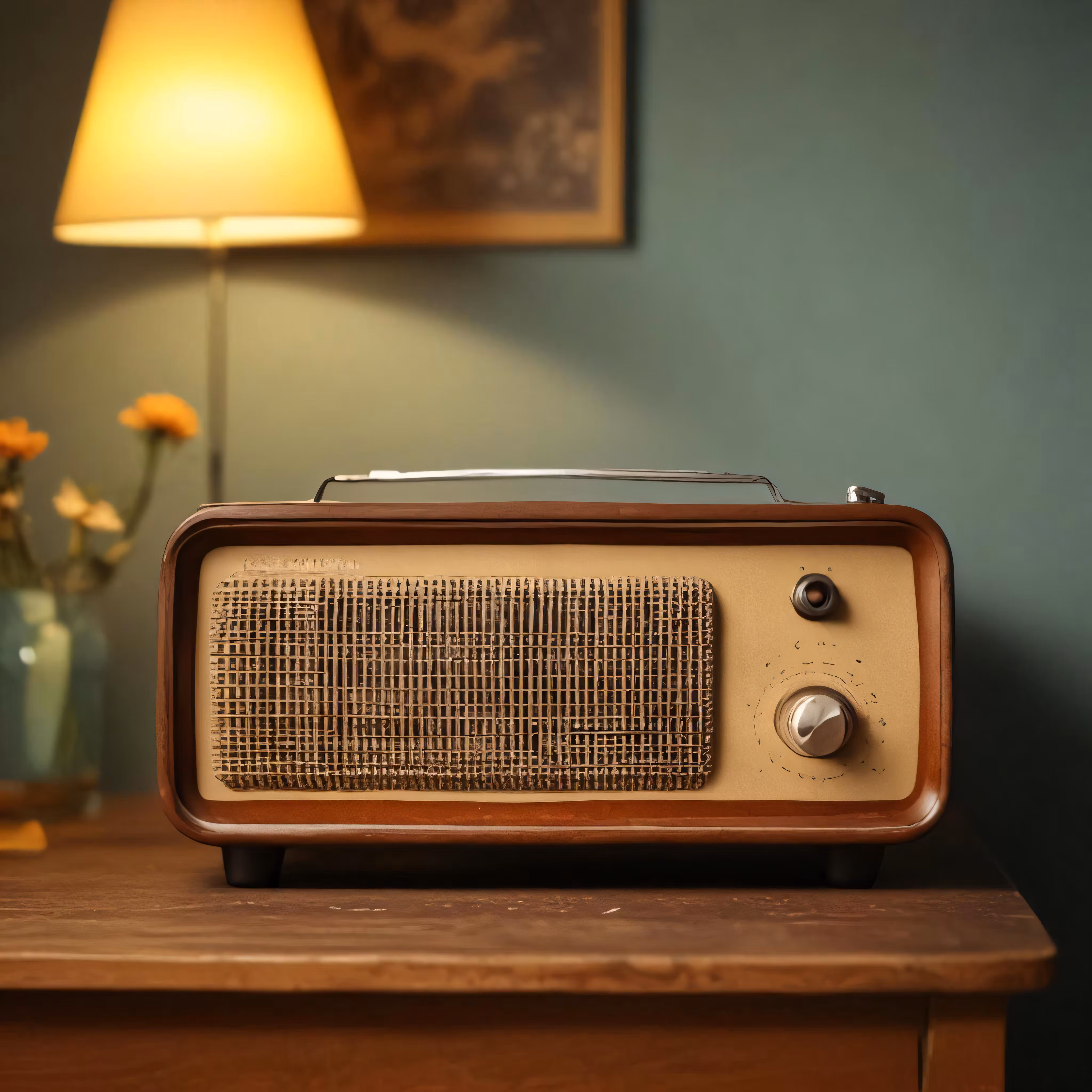 High resolution picture, free to use, the official logo for the 50 /an old fashioned radio is on a wood table