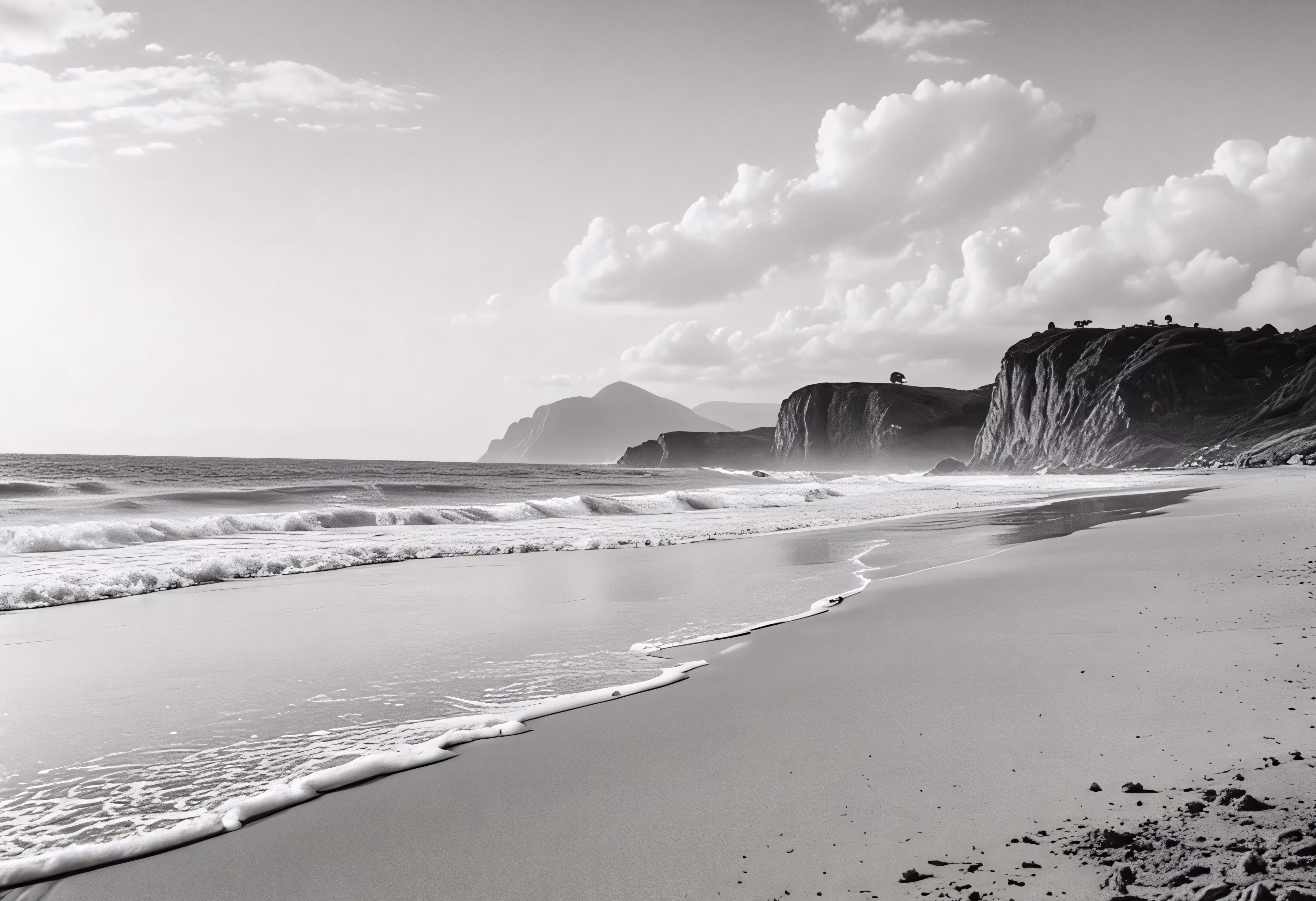 High resolution picture, free to use, the official logo for the 50 /black and white photo of ocean waves with beach in foreground