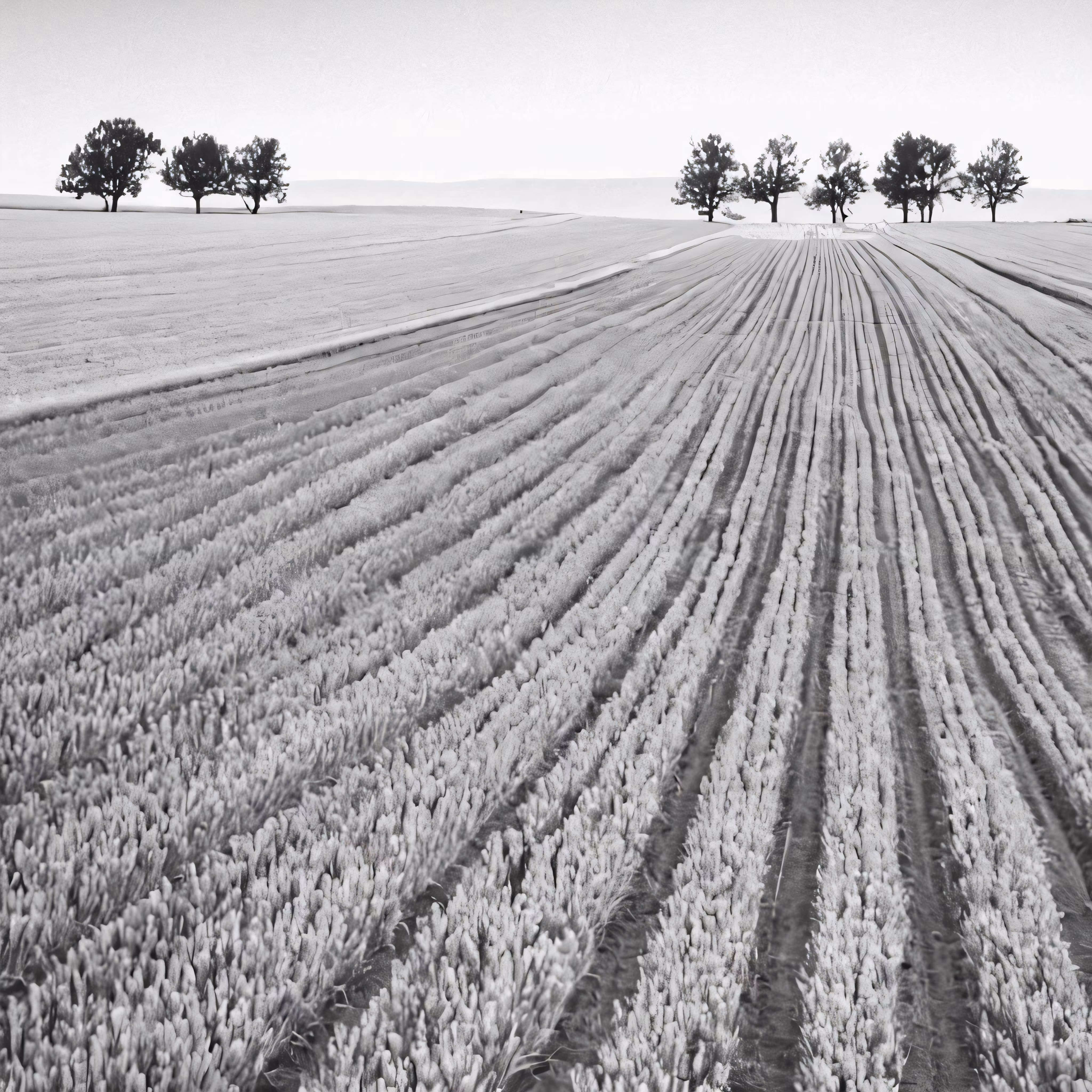 High resolution picture, free to use, the official logo for the 50 /black and white photograph of crops in a field