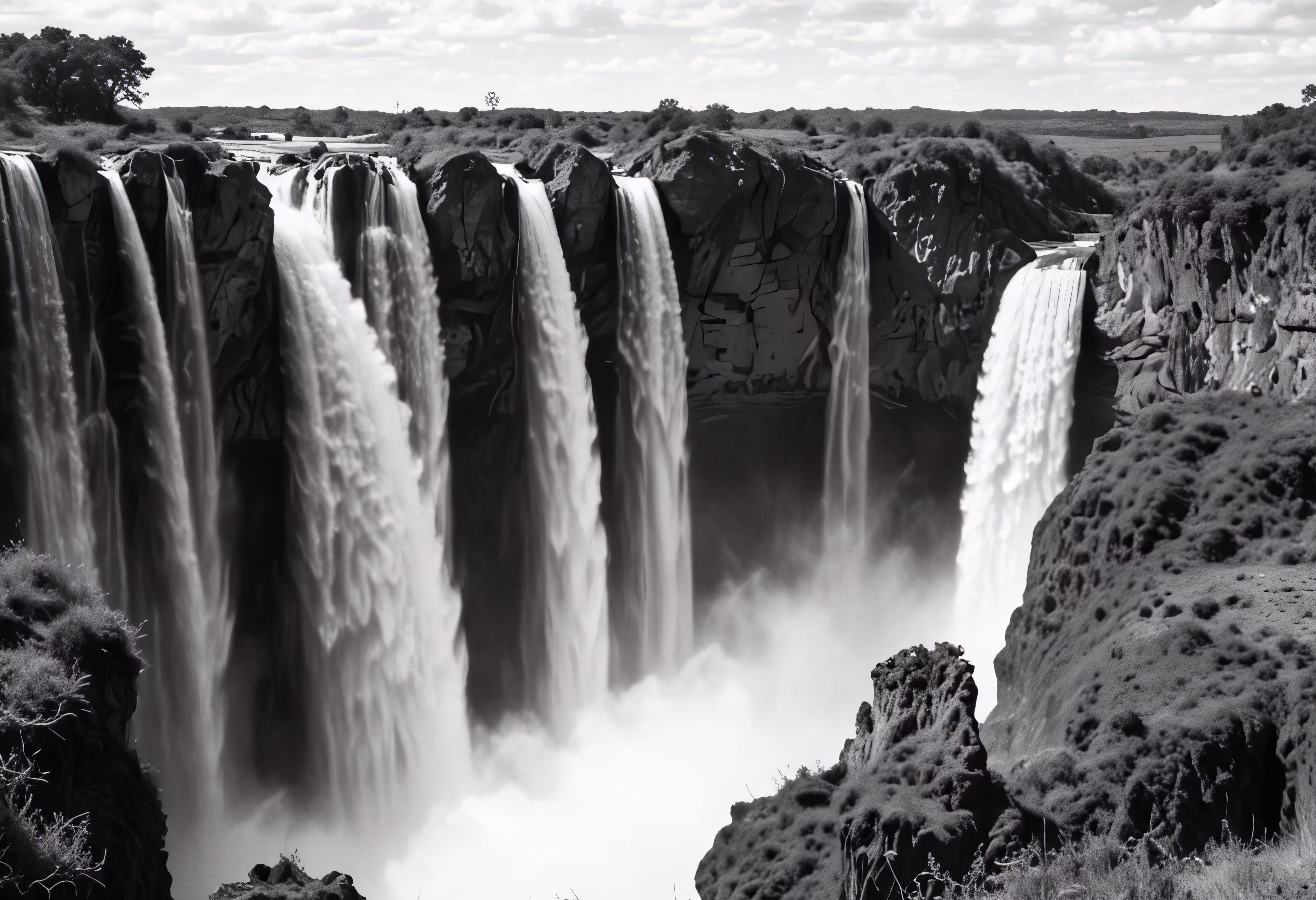 High resolution picture, free to use, the official logo for the 50 /black and white photograph of the water pouring at niagara falls