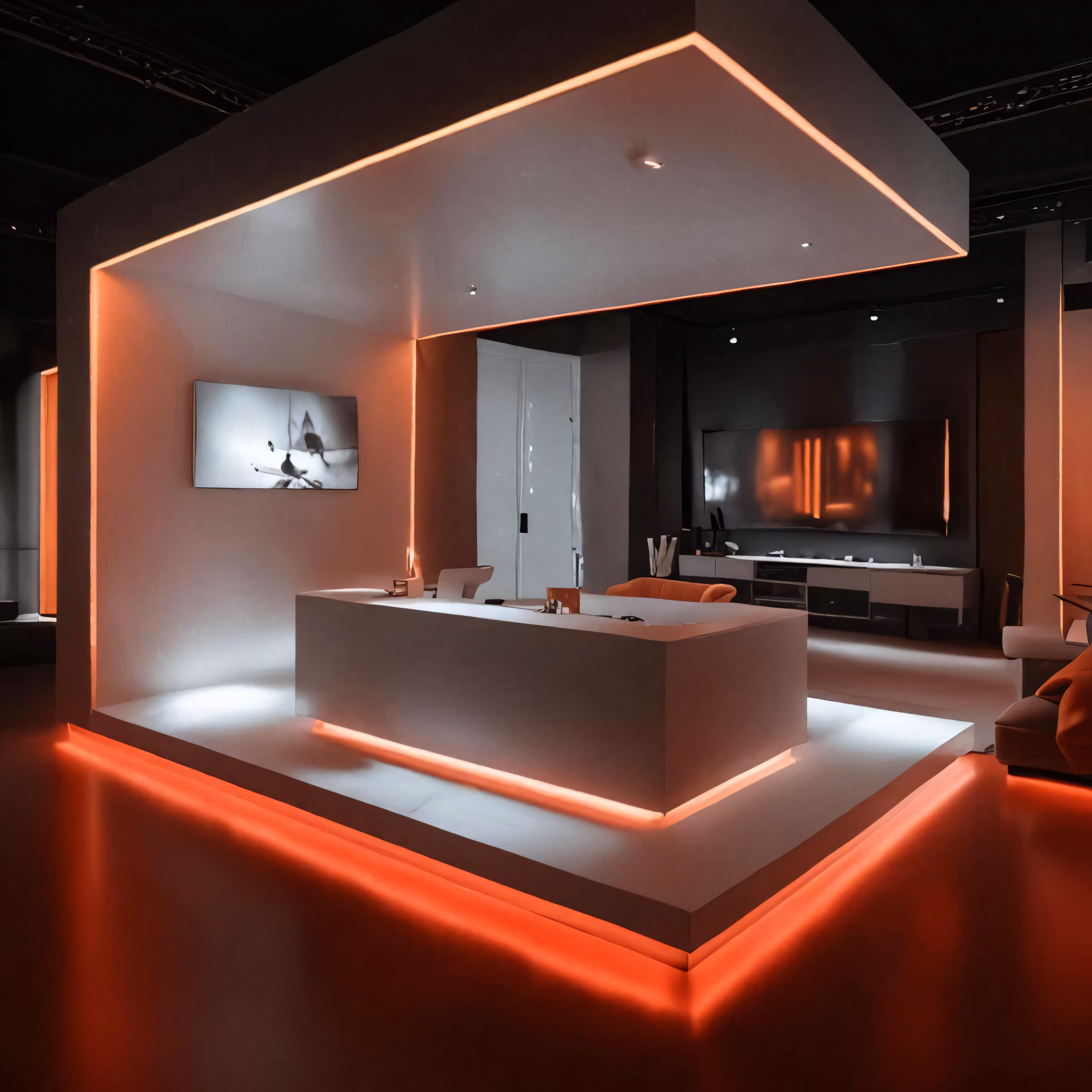 High resolution picture, free to use, the official logo for the 50 /large modern room with a white counter illuminated in red lights