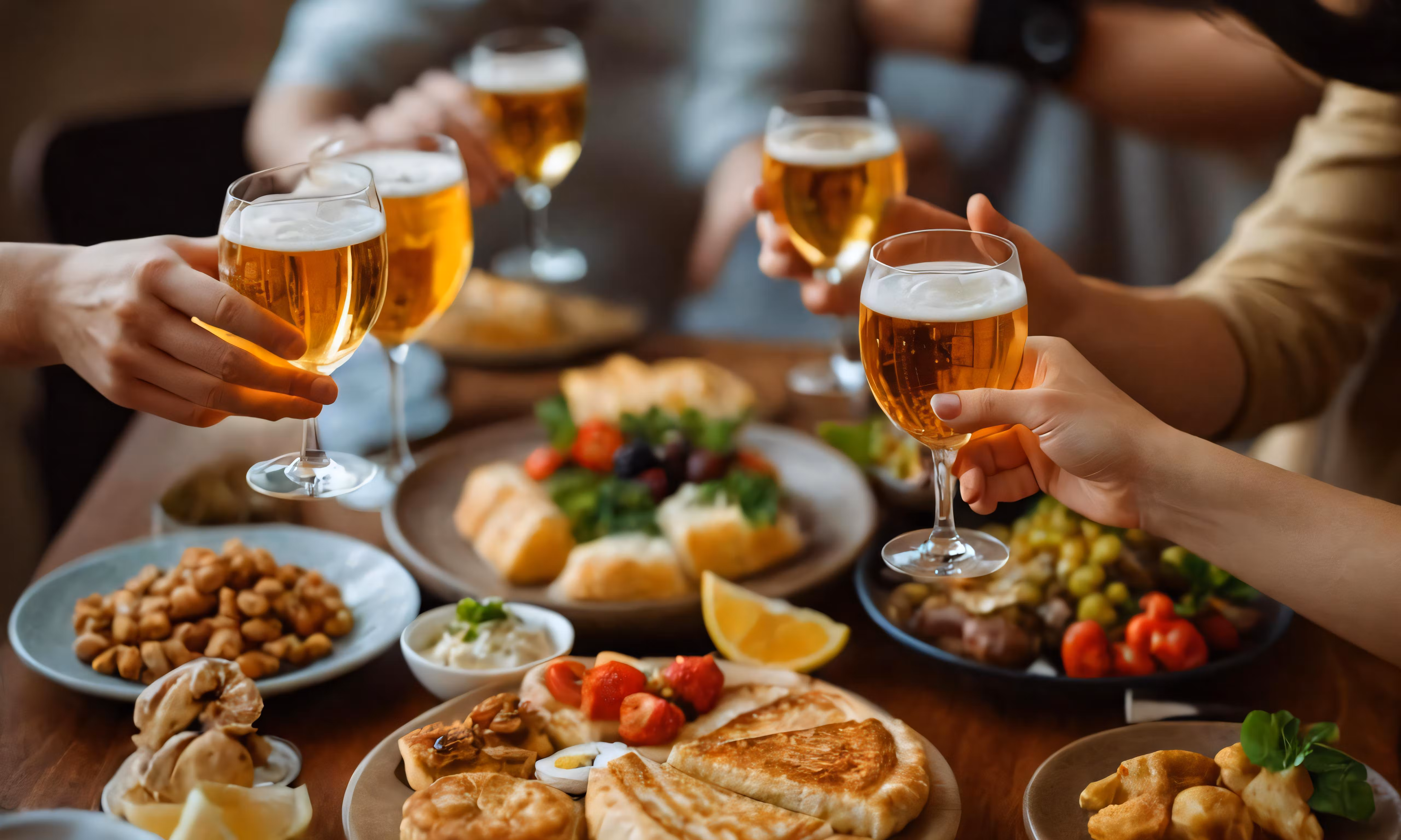 High resolution picture, free to use, the official logo for the 50 /people holding glasses of beer celebrating with food