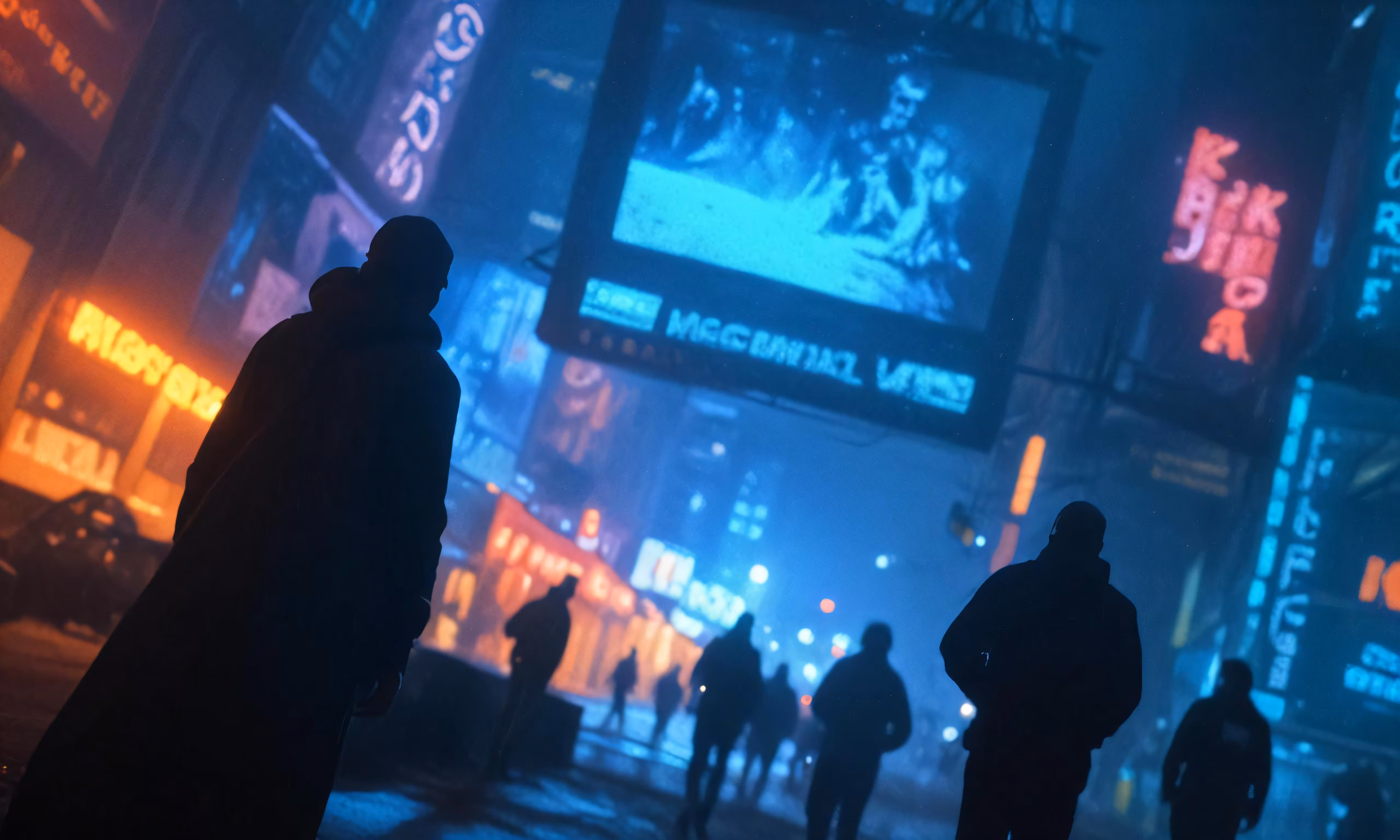 High resolution picture, free to use, the official logo for the 50 /people walking in the middle of a city with neon lights