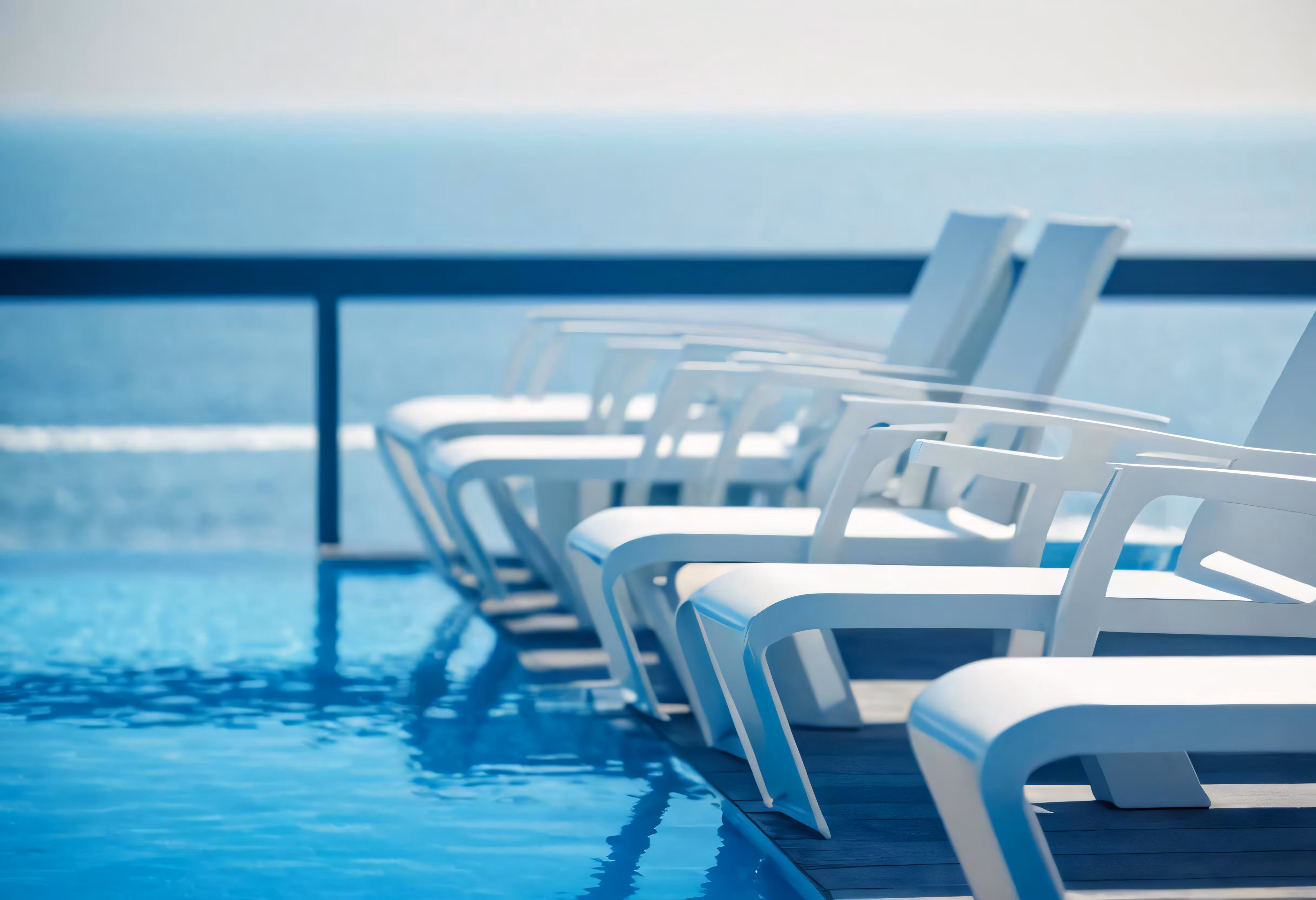 High resolution picture, free to use, the official logo for the 50 /rows of beach chairs sit in front of an empty swimming pool