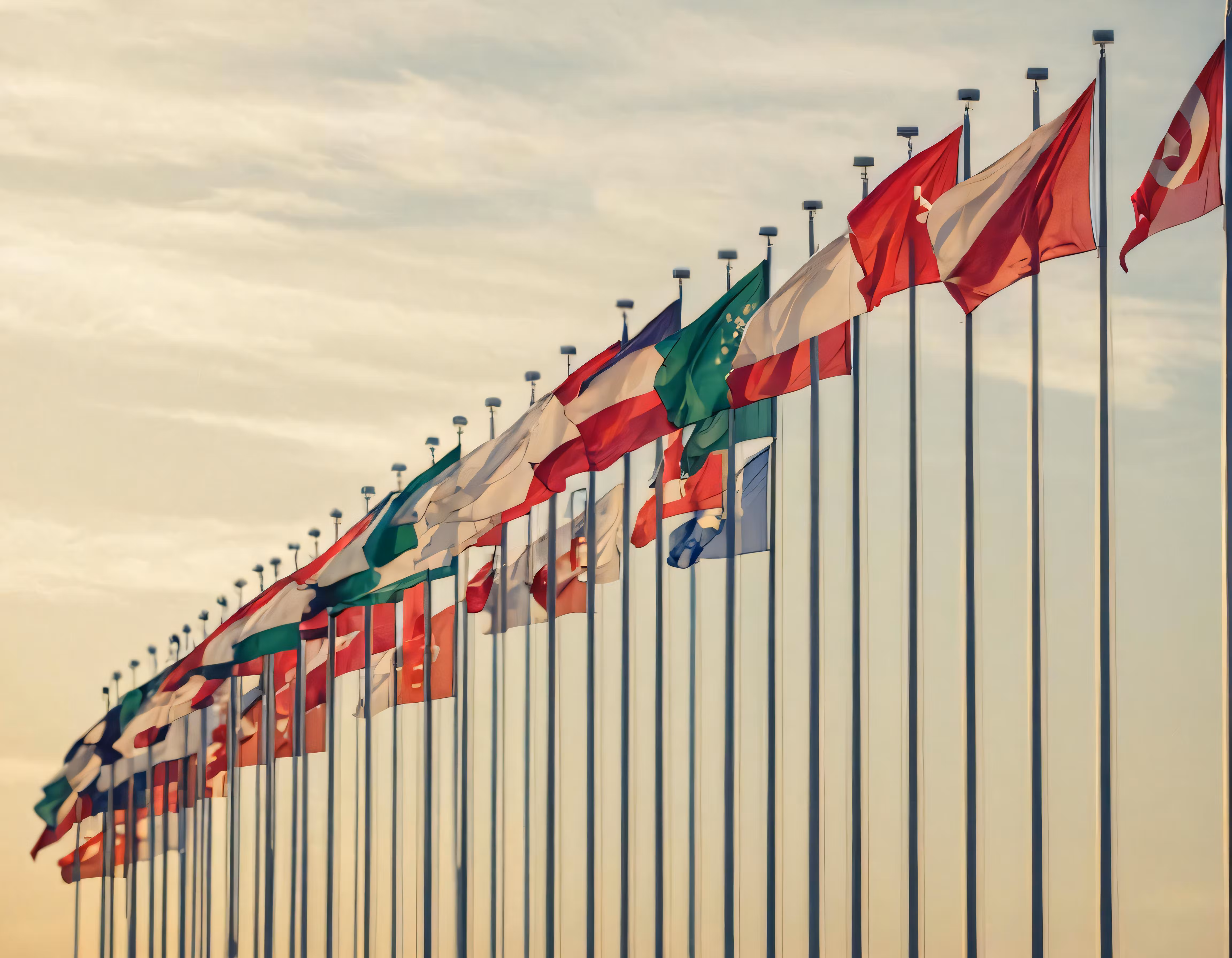High resolution picture, free to use, the official logo for the 50 /rows of flags waving in the wind under a cloudy sky