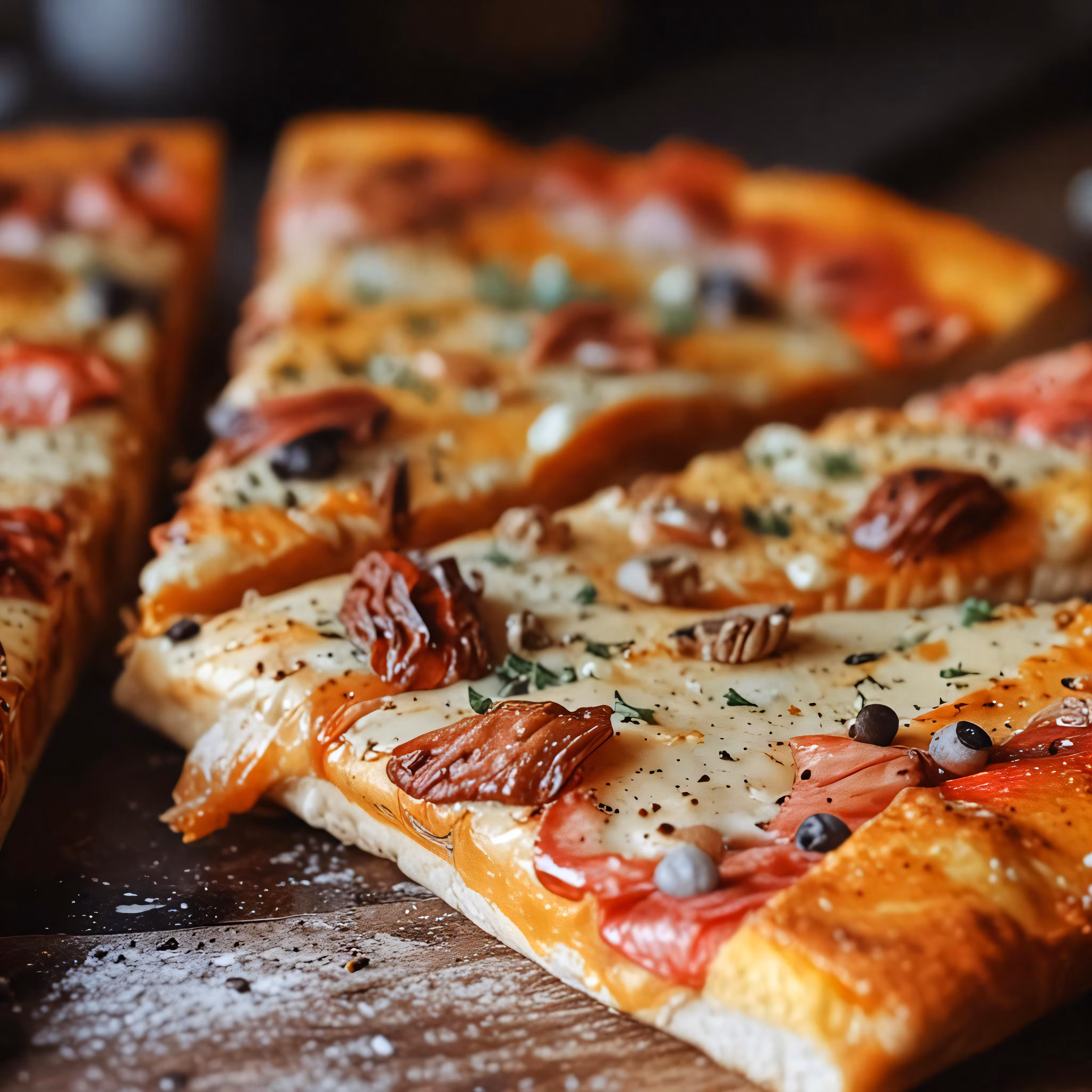 High resolution picture, free to use, the official logo for the 50 /slices of a pizza on a wooden table