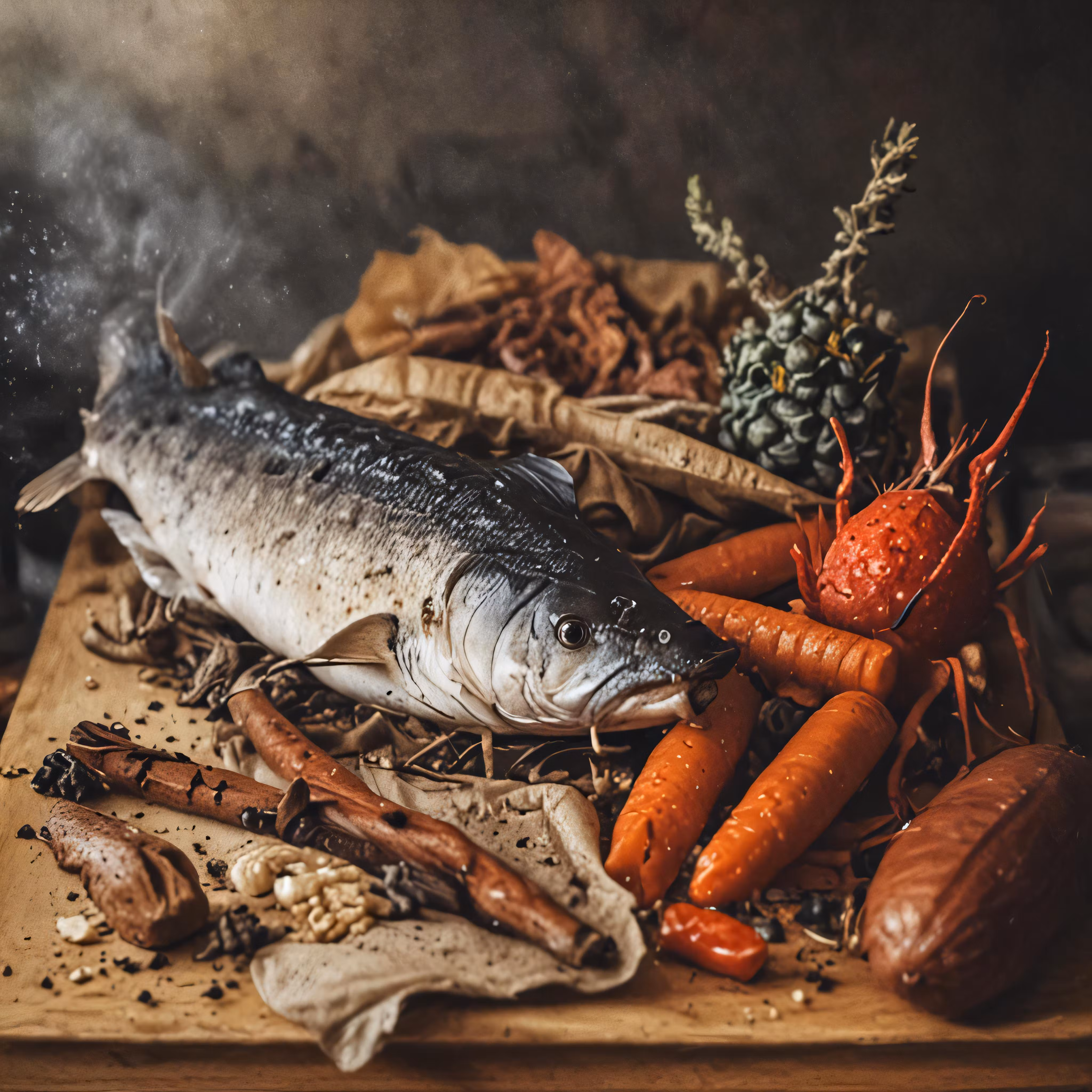 High resolution picture, free to use, the official logo for the 50 /some kind of fish in the middle of many different foods