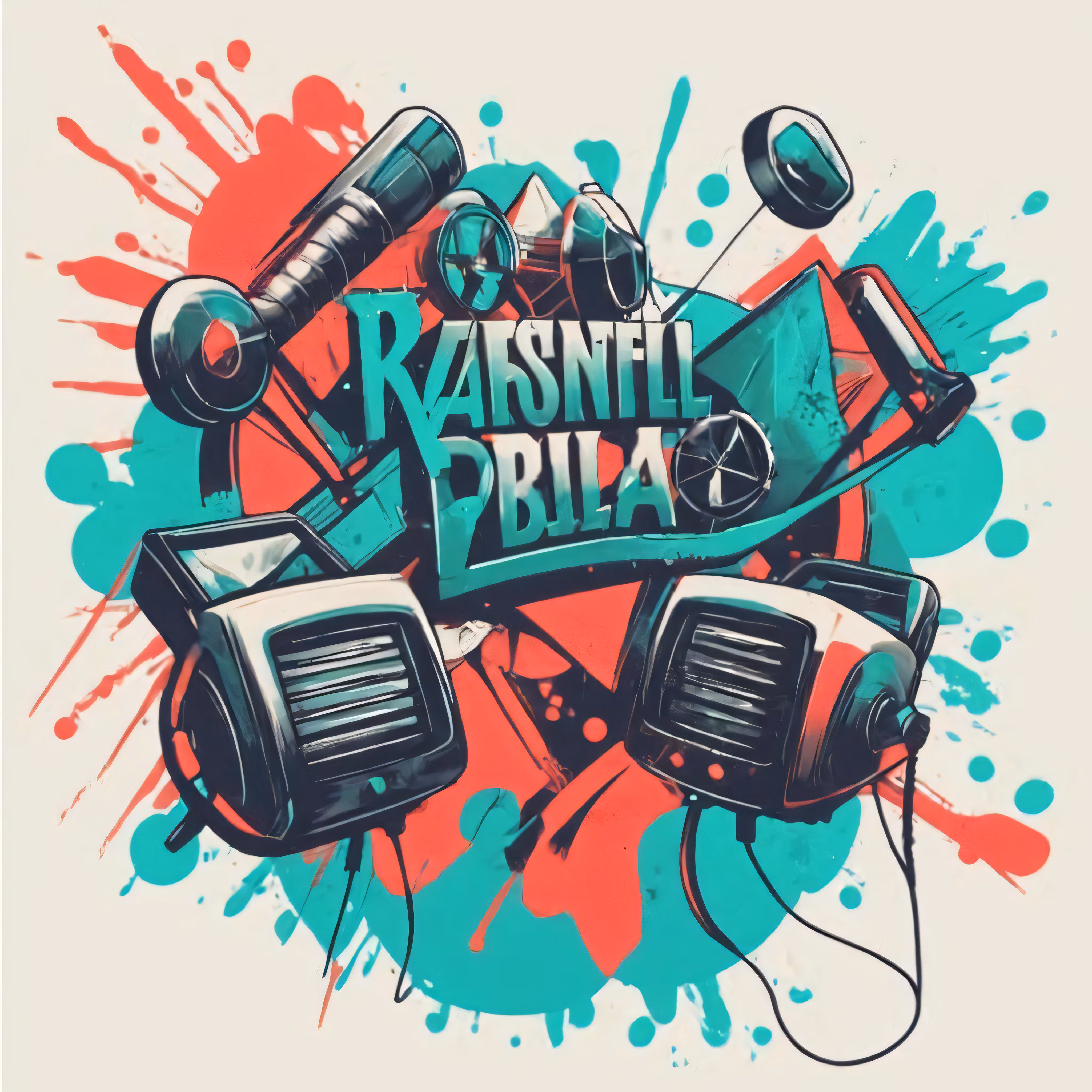 High resolution picture, free to use, the official logo for the 50 /some old school radio headsets and a paint splattered background