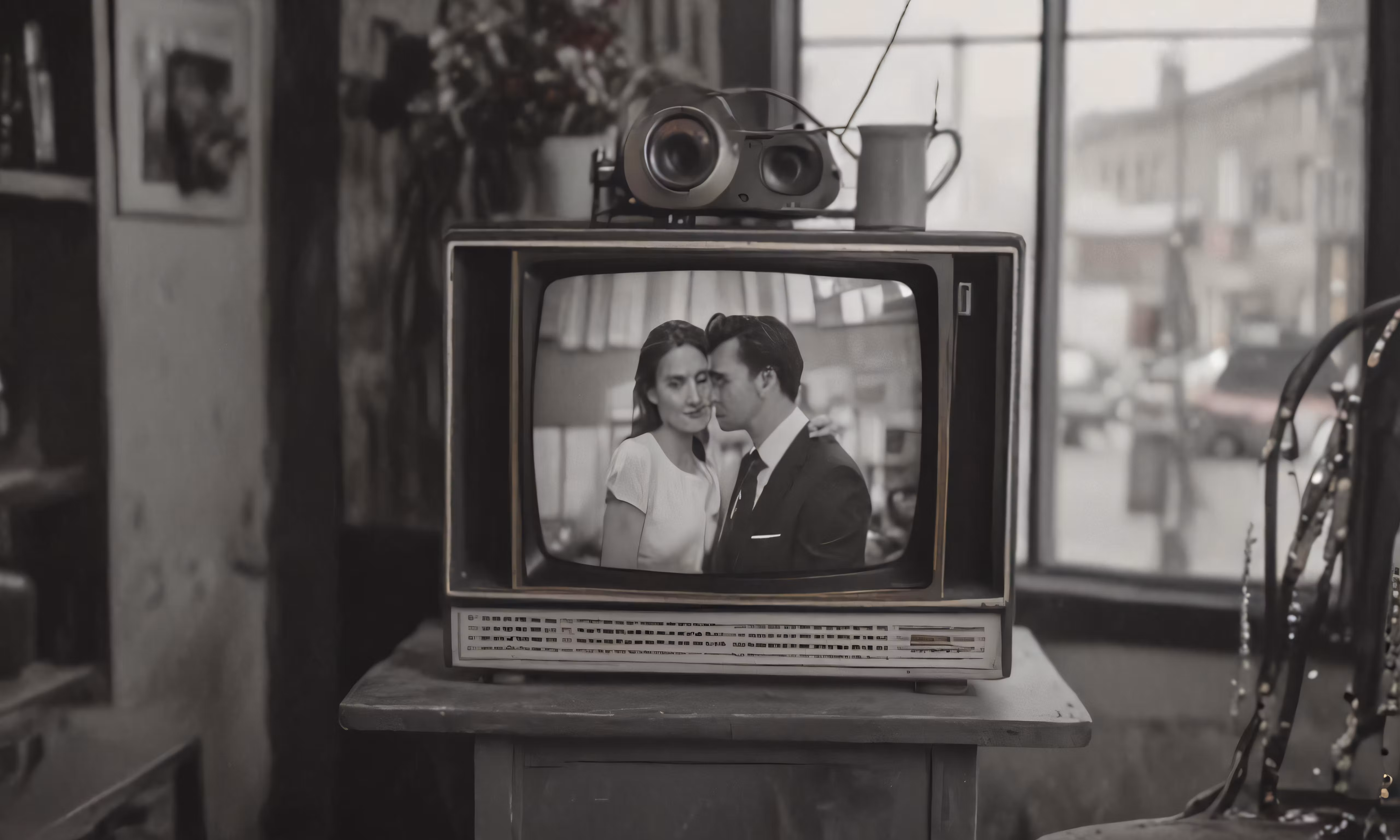 High resolution picture, free to use, the official logo for the 50 /the couple is on their tv set in the living room