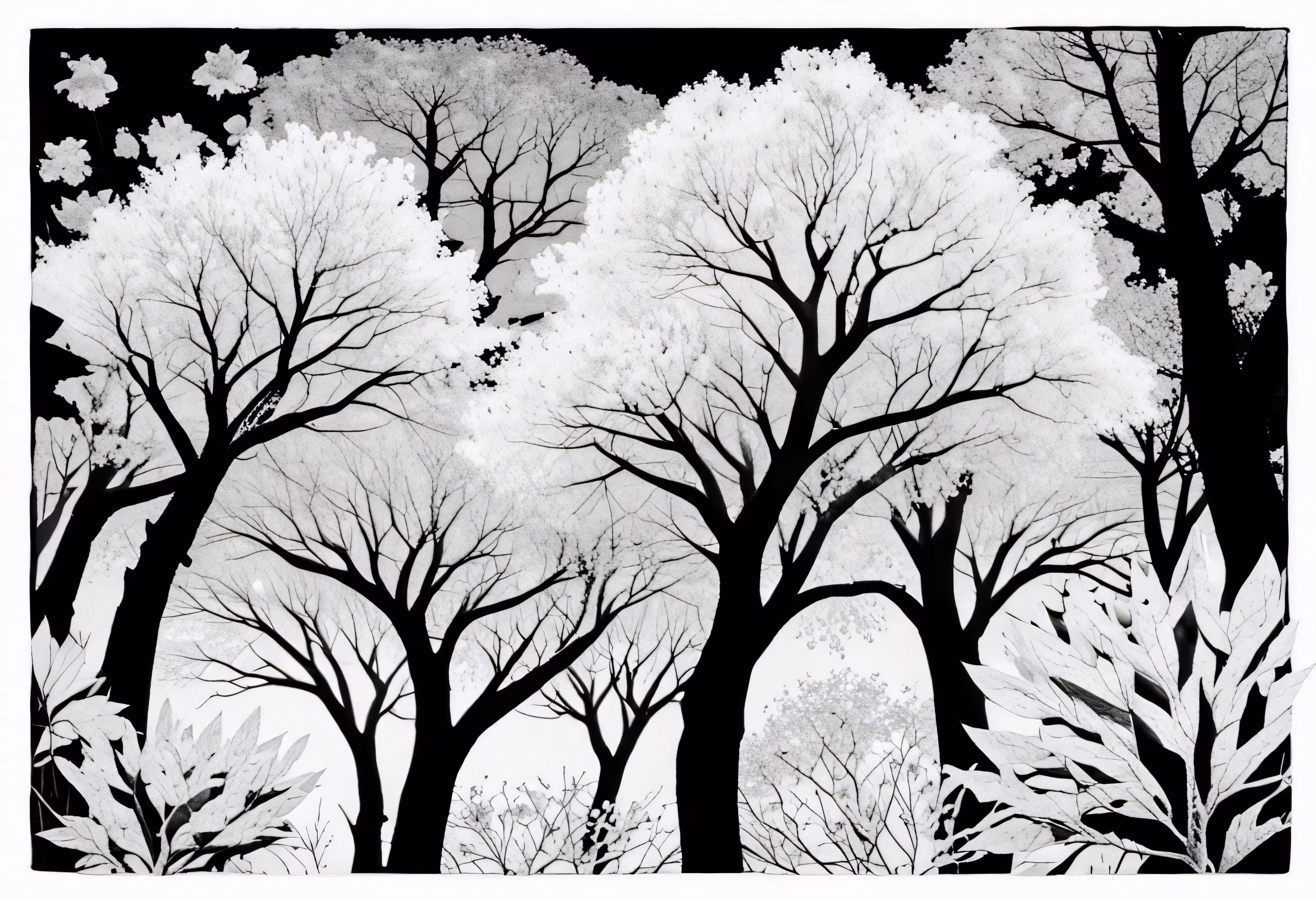 High resolution picture, free to use, the official logo for the 50 /the entrance to an exterior store called books /black and white art with trees and leaves