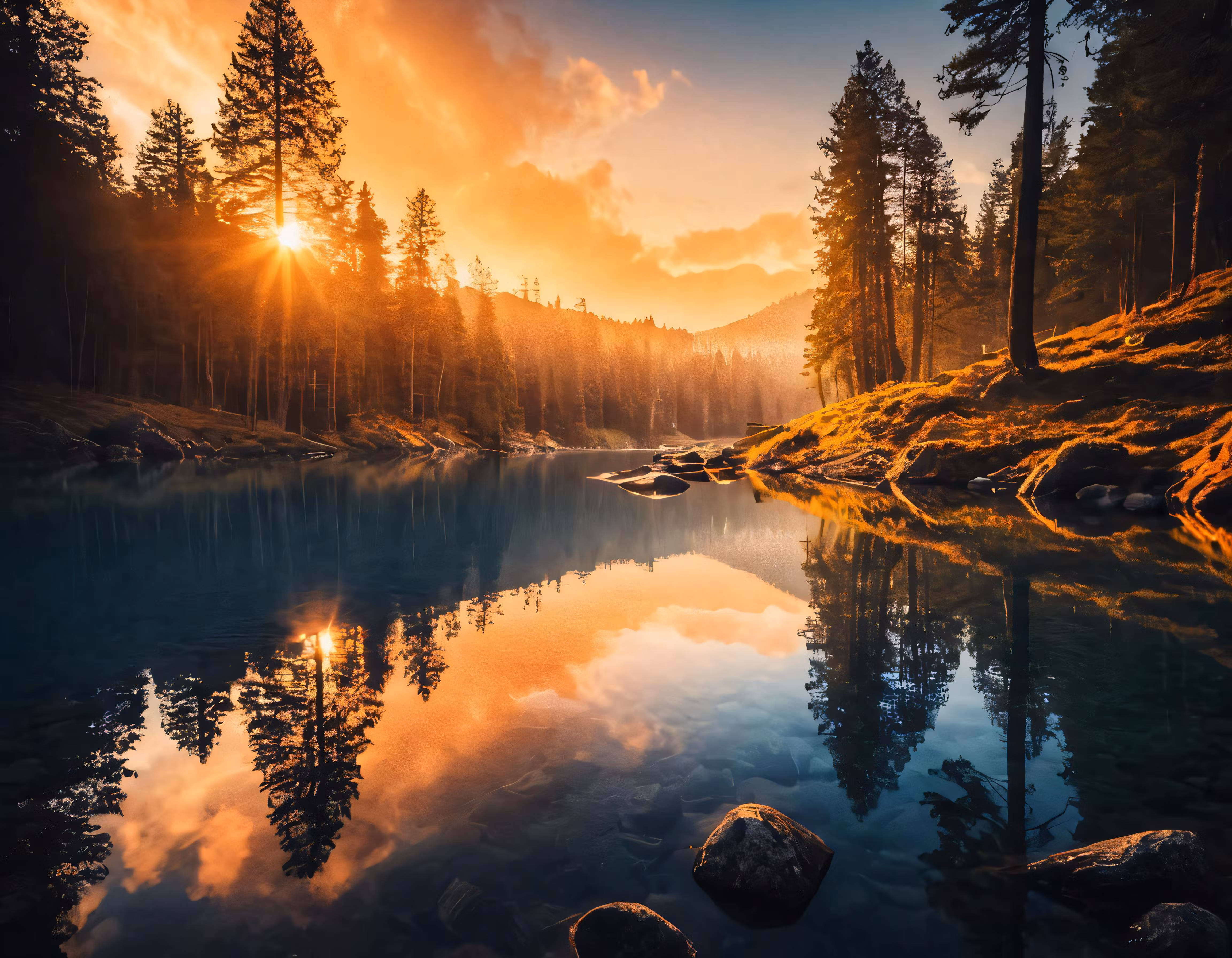 High resolution picture, free to use, the official logo for the 50 /the sun is setting on a beautiful lake near a forest