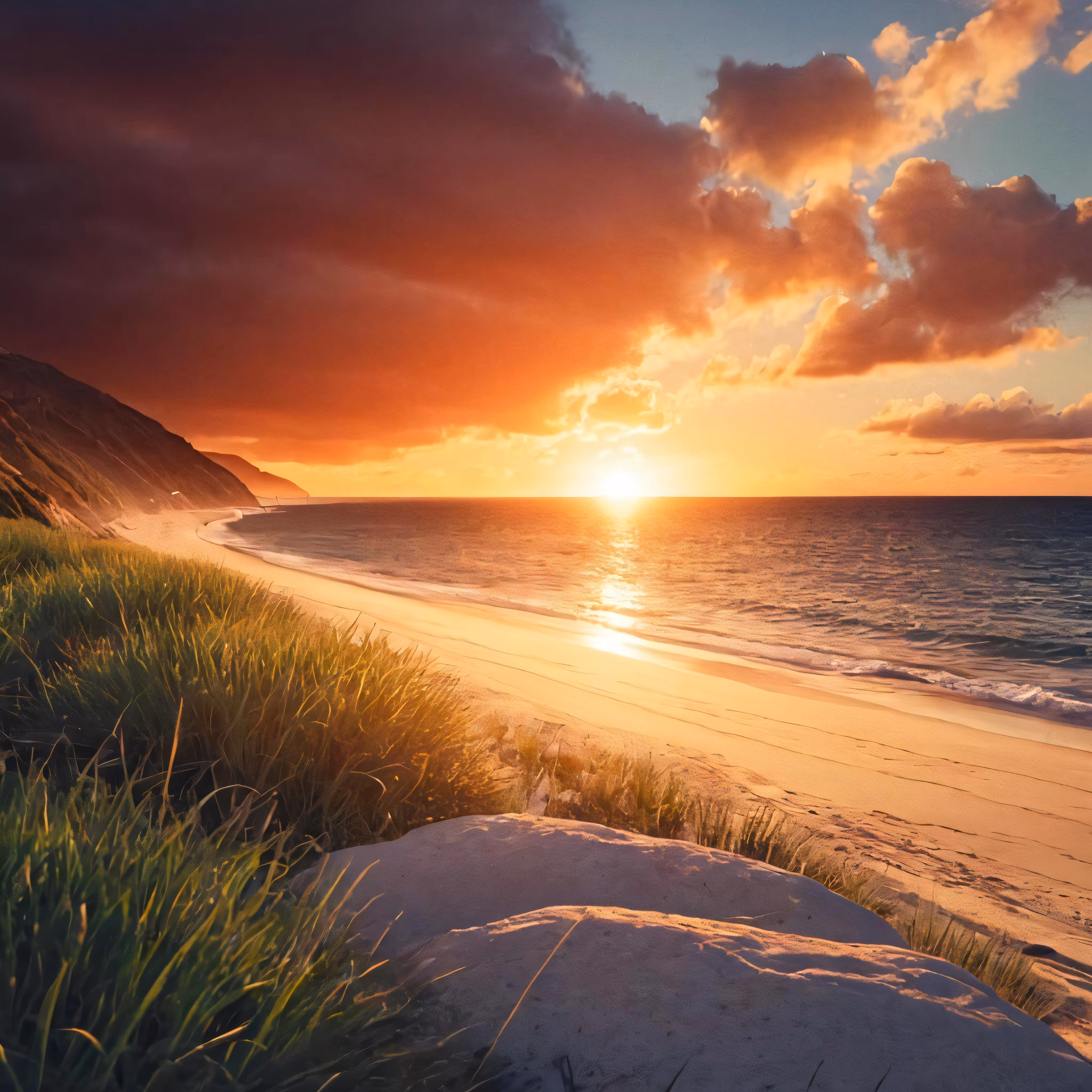 High resolution picture, free to use, the official logo for the 50 /the sun sets behind clouds over the beach