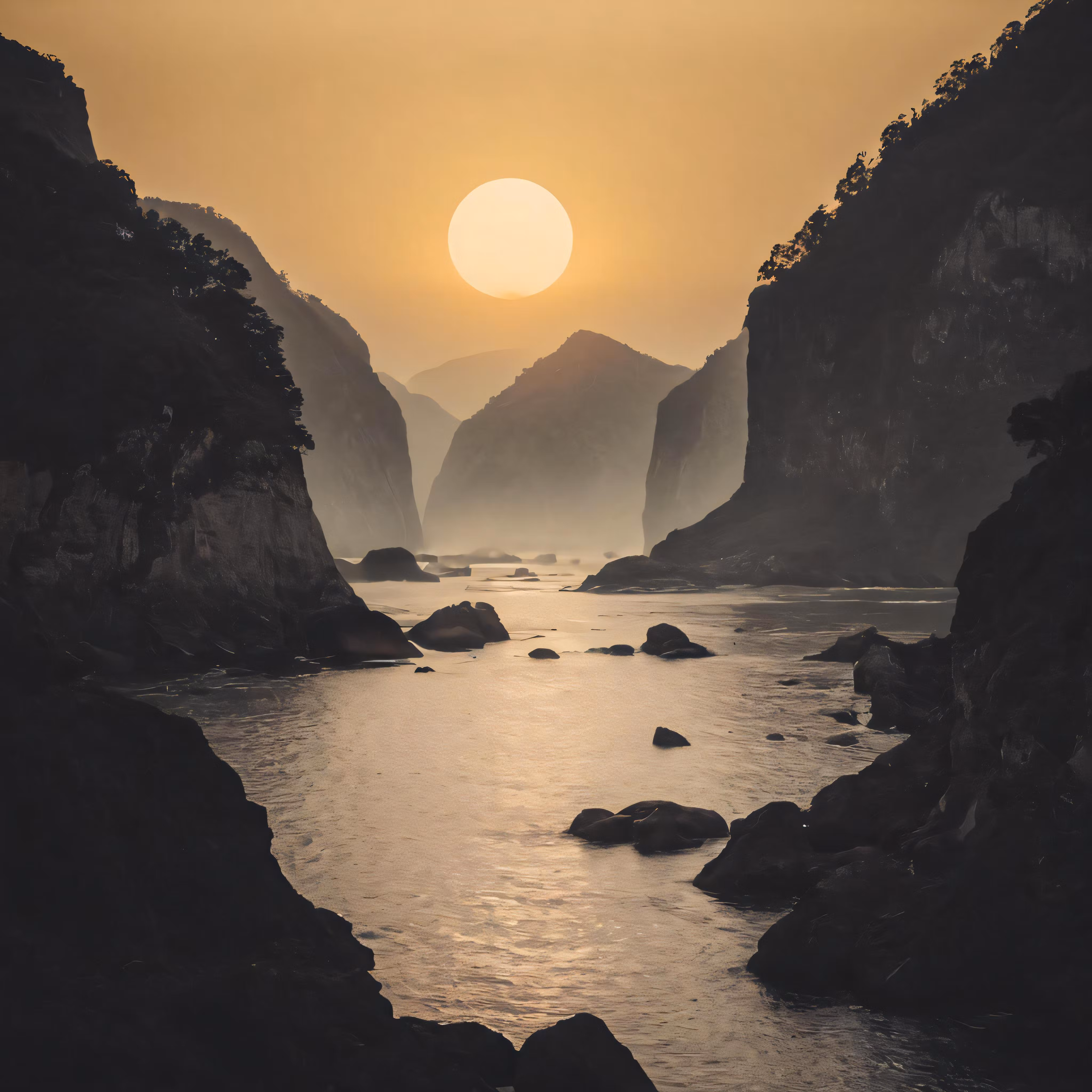 High resolution picture, free to use, the official logo for the 50 /the sun sets over some rocks near a body of water
