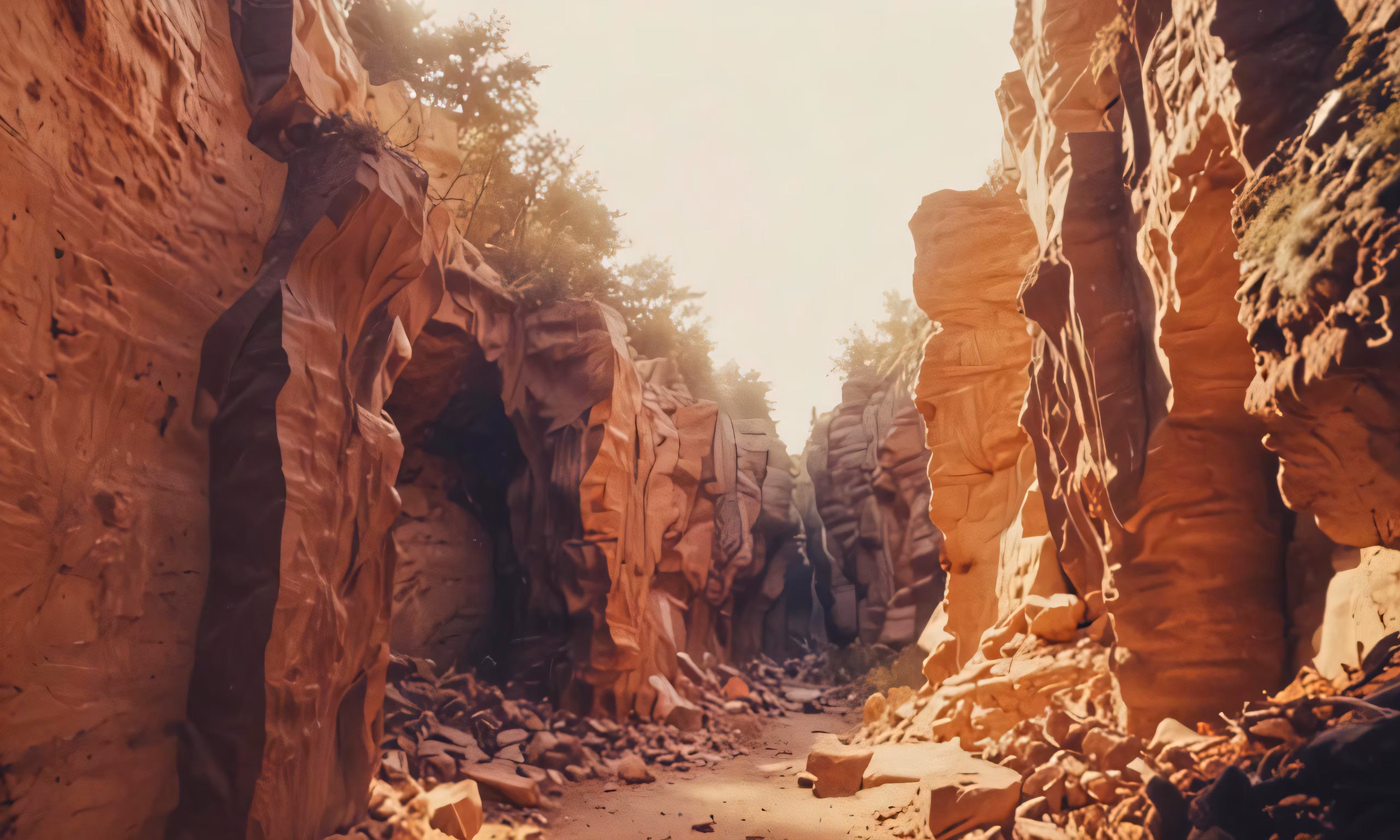 High resolution picture, free to use, the official logo for the 50 /the sun shines on the rocky cliffs by a pathway