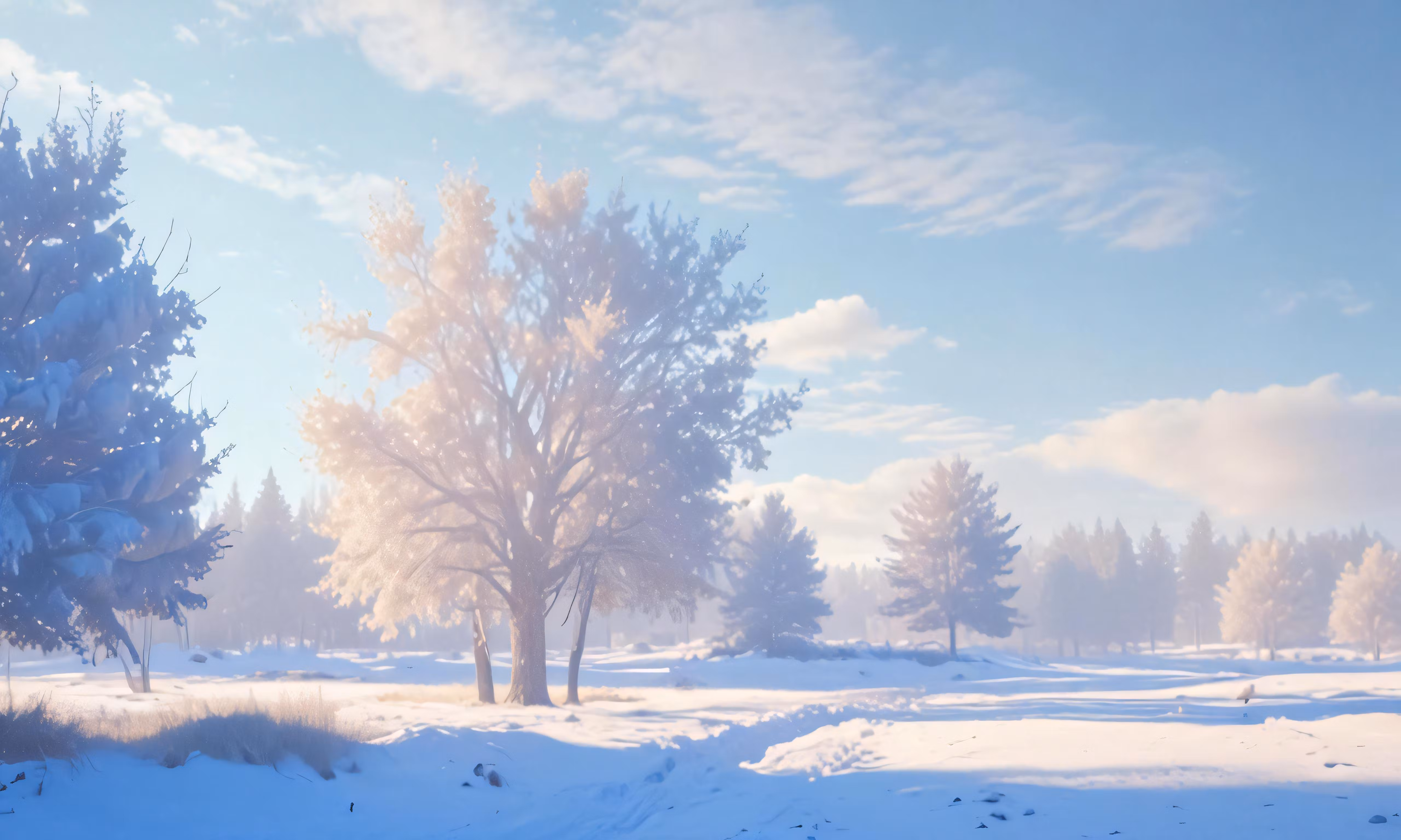 High resolution picture, free to use, the official logo for the 50 /the sun shining through the trees and snow