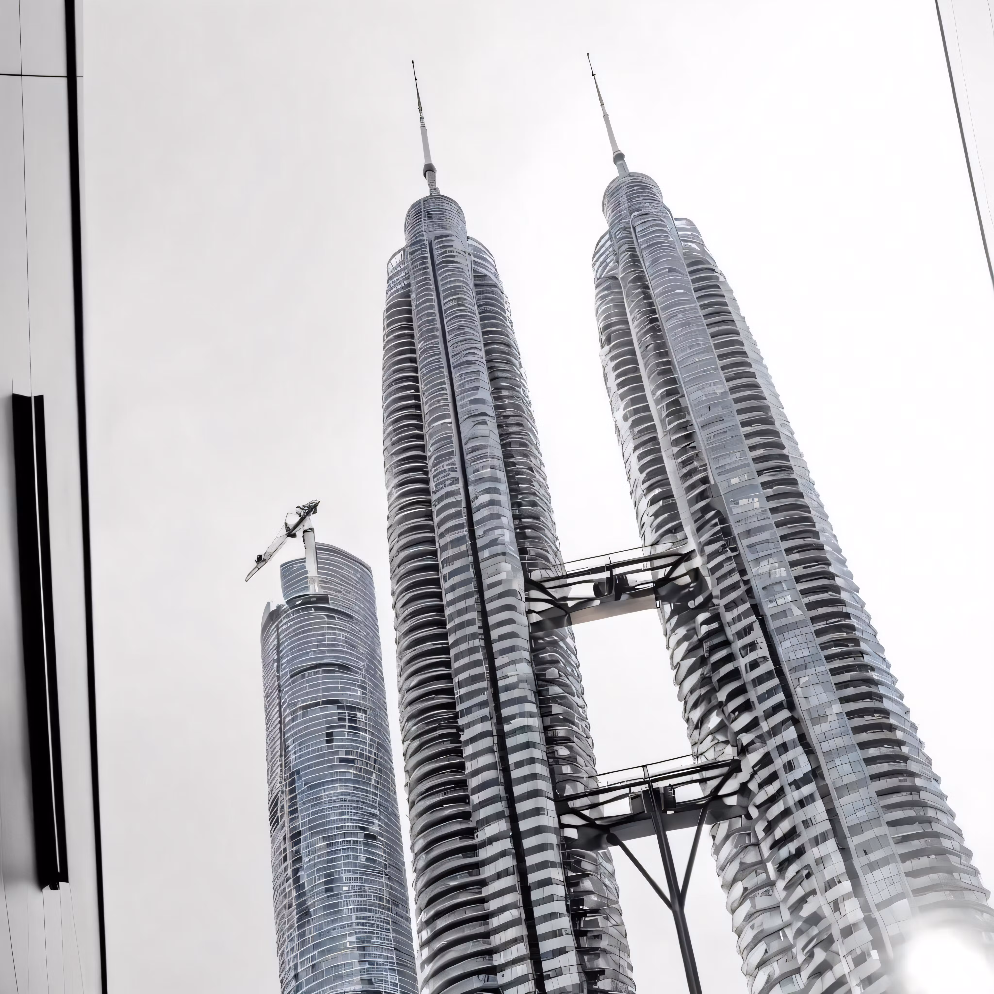 High resolution picture, free to use, the official logo for the 50 /the twin buildings, located in the business district of the city, can be seen from either side