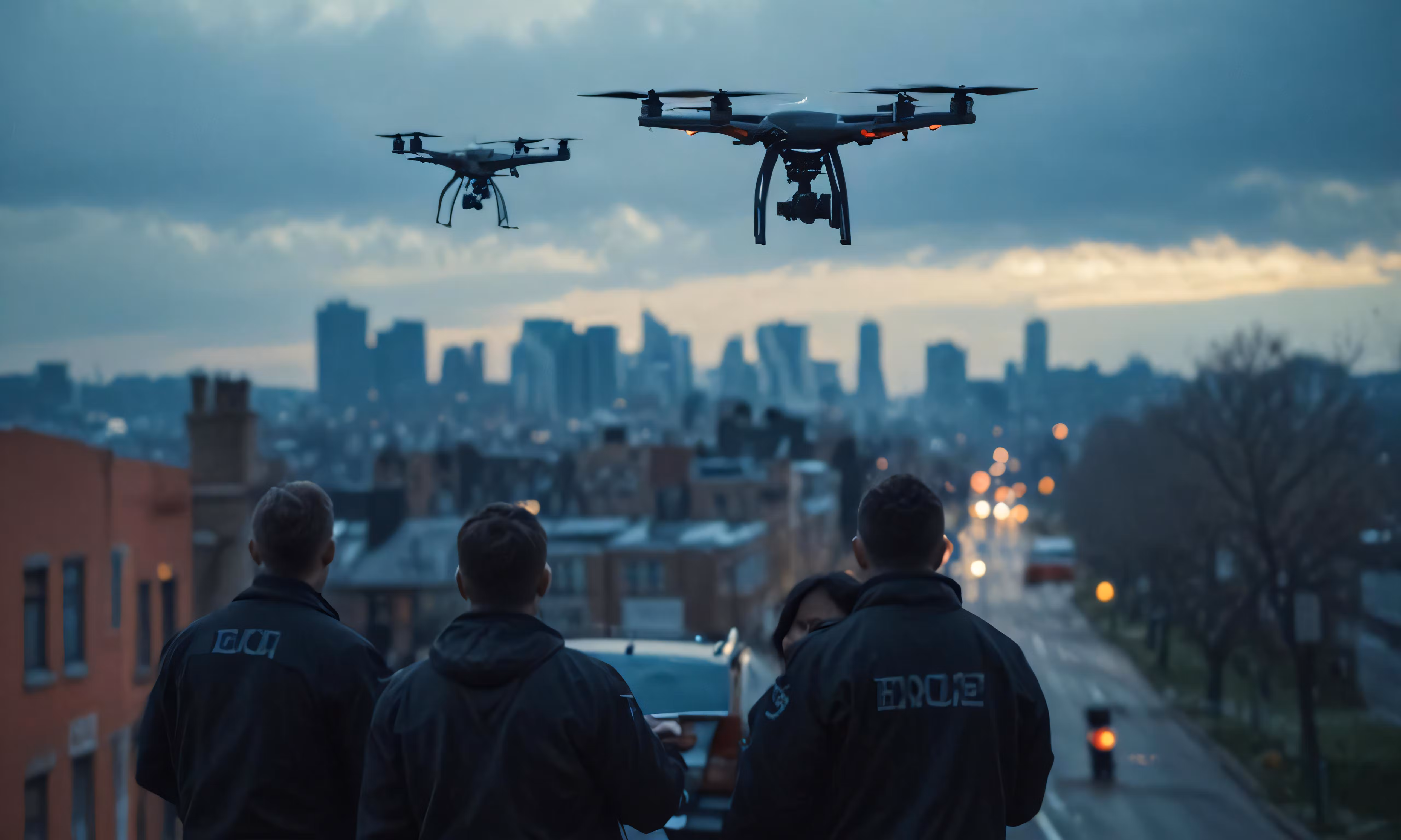High resolution picture, free to use, the official logo for the 50 /three men stand in front of a building watching an overhead photo
