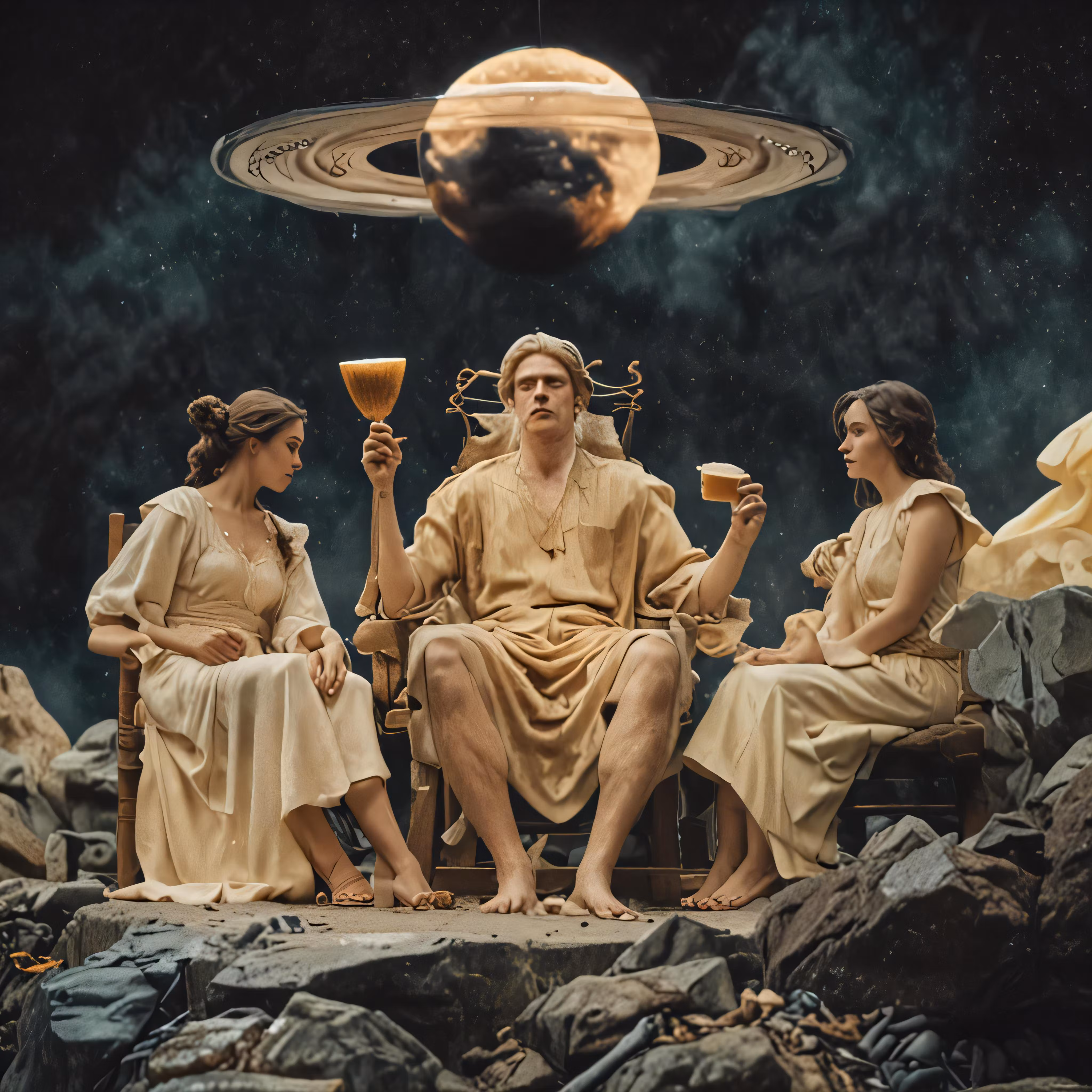 High resolution picture, free to use, the official logo for the 50 /three women sitting on a bench in front of a science fiction scene