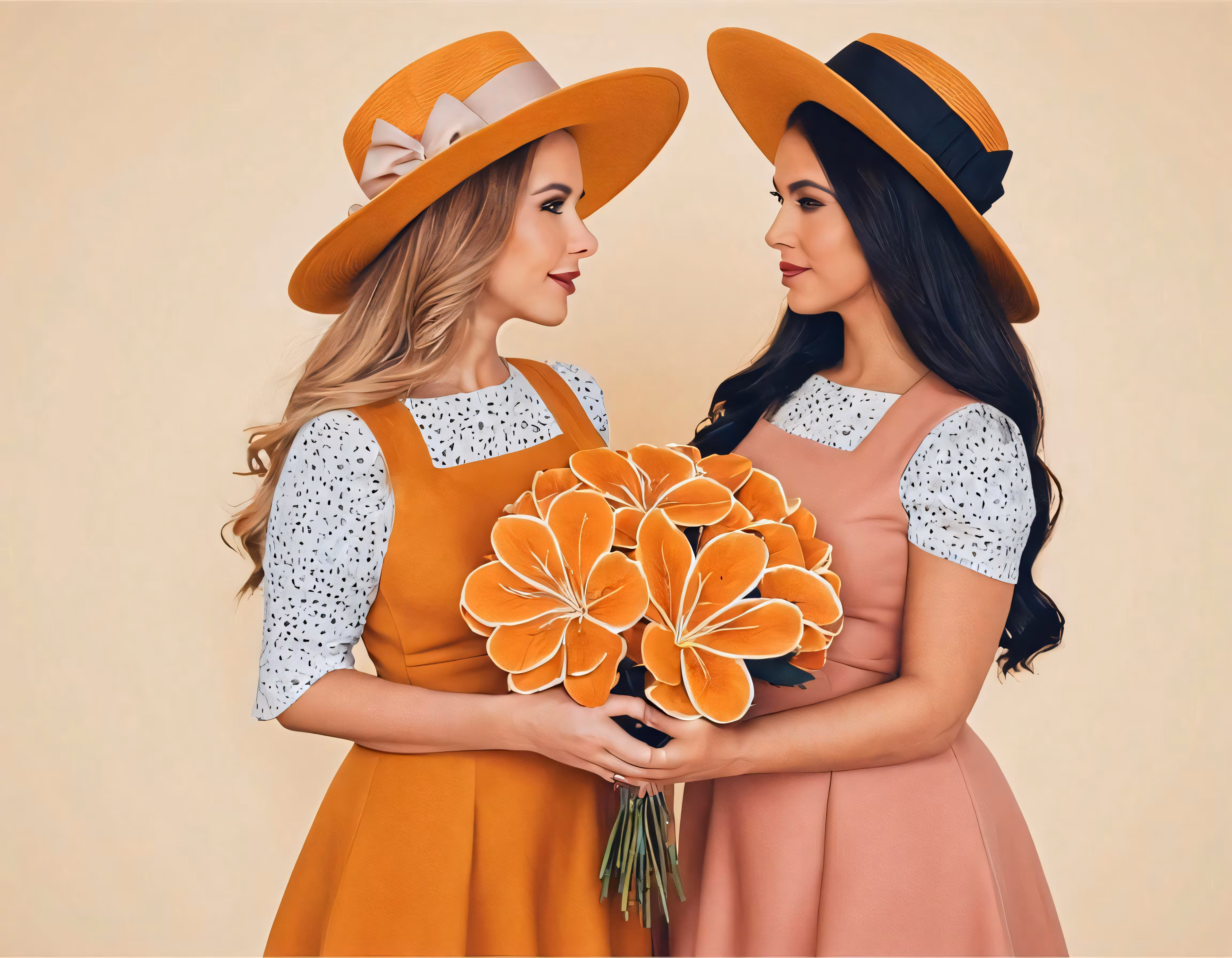 High resolution picture, free to use, the official logo for the 50 /two girls dressed in identical outfits holding flowers