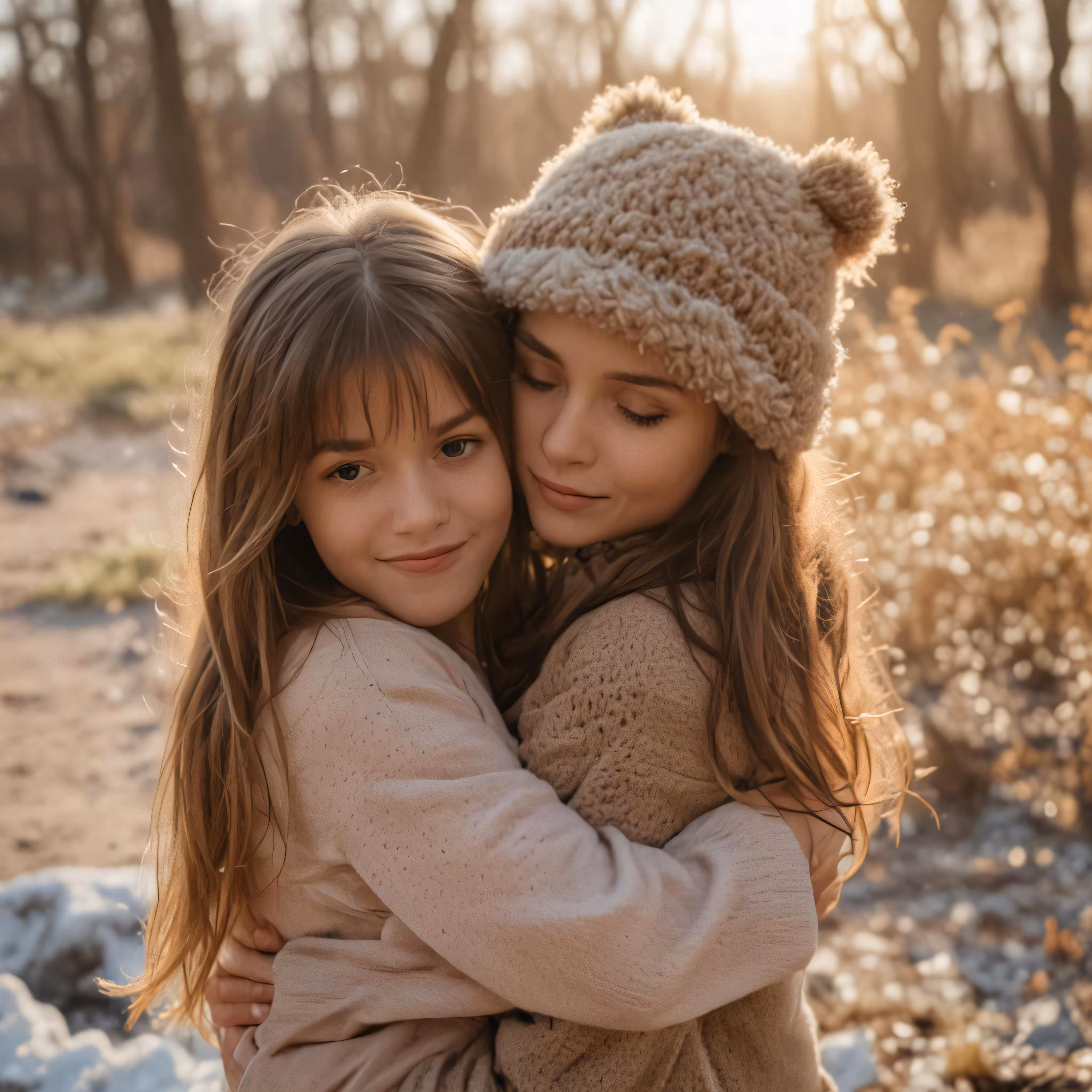 High resolution picture, free to use, the official logo for the 50 /two little girls hugging and cuddling in front of trees