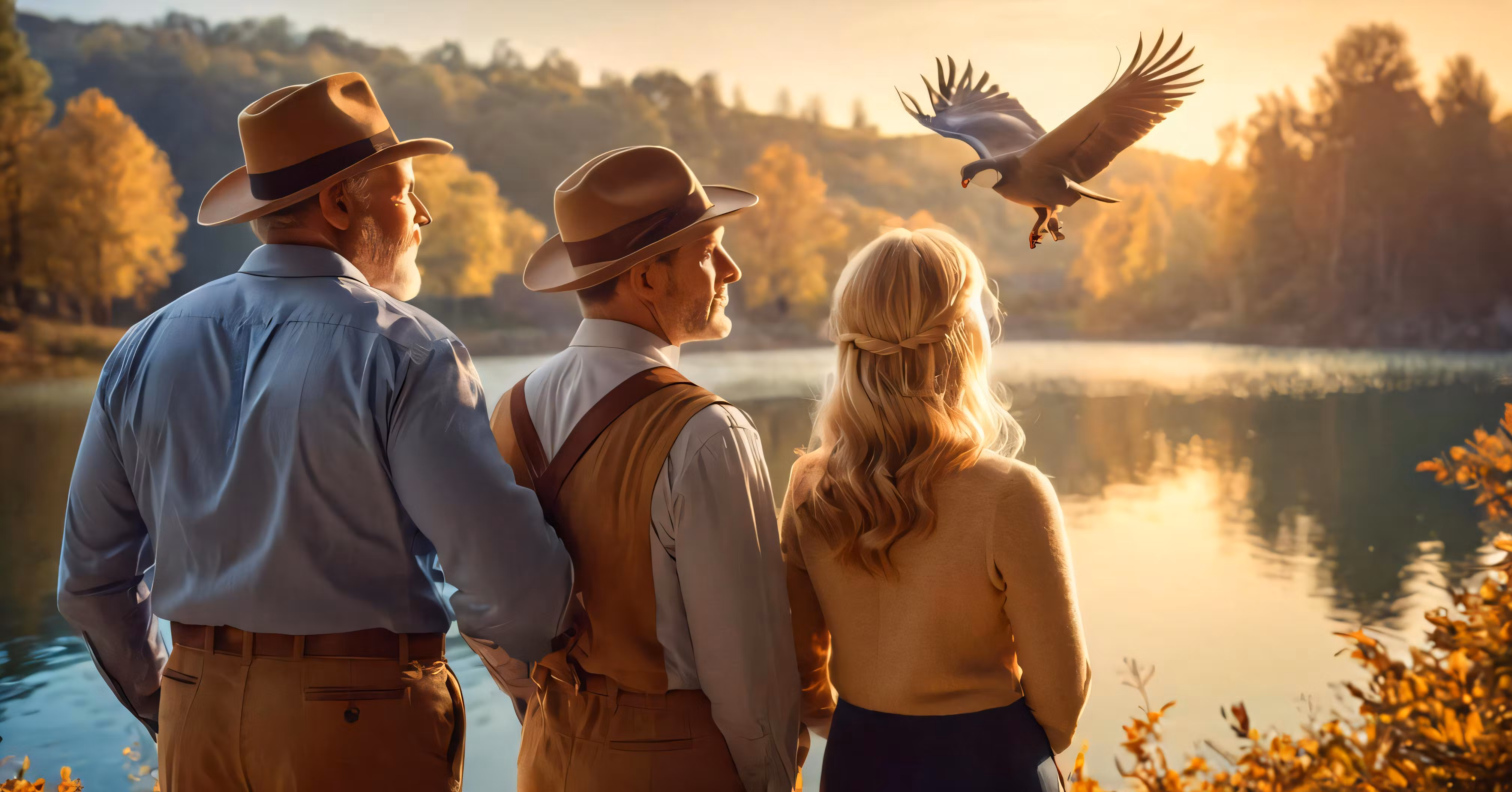 High resolution picture, free to use, the official logo for the 50 /two men and one woman look at the birds flying above them