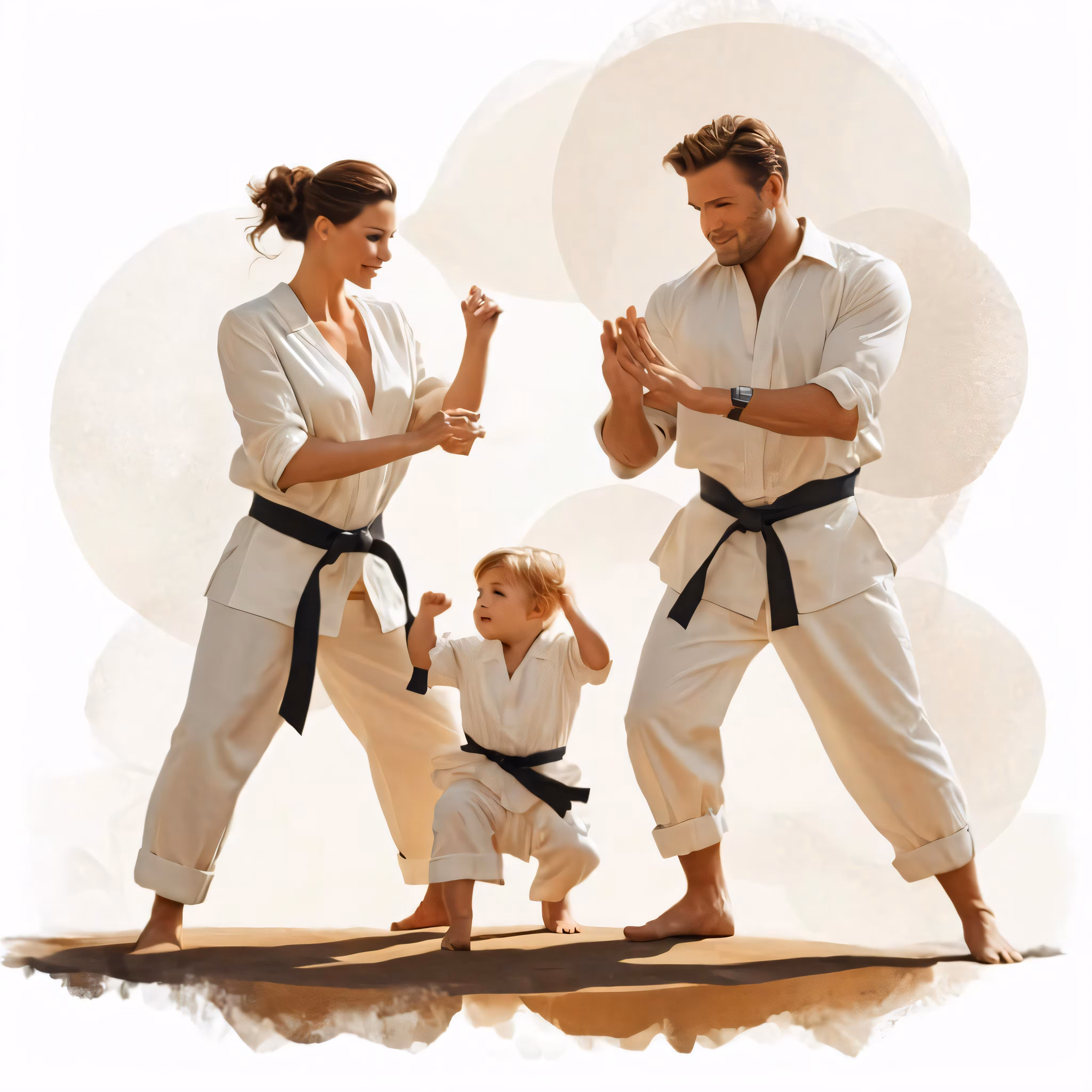 High resolution picture, free to use, the official logo for the 50 /two people are practicing karate with one holding a child