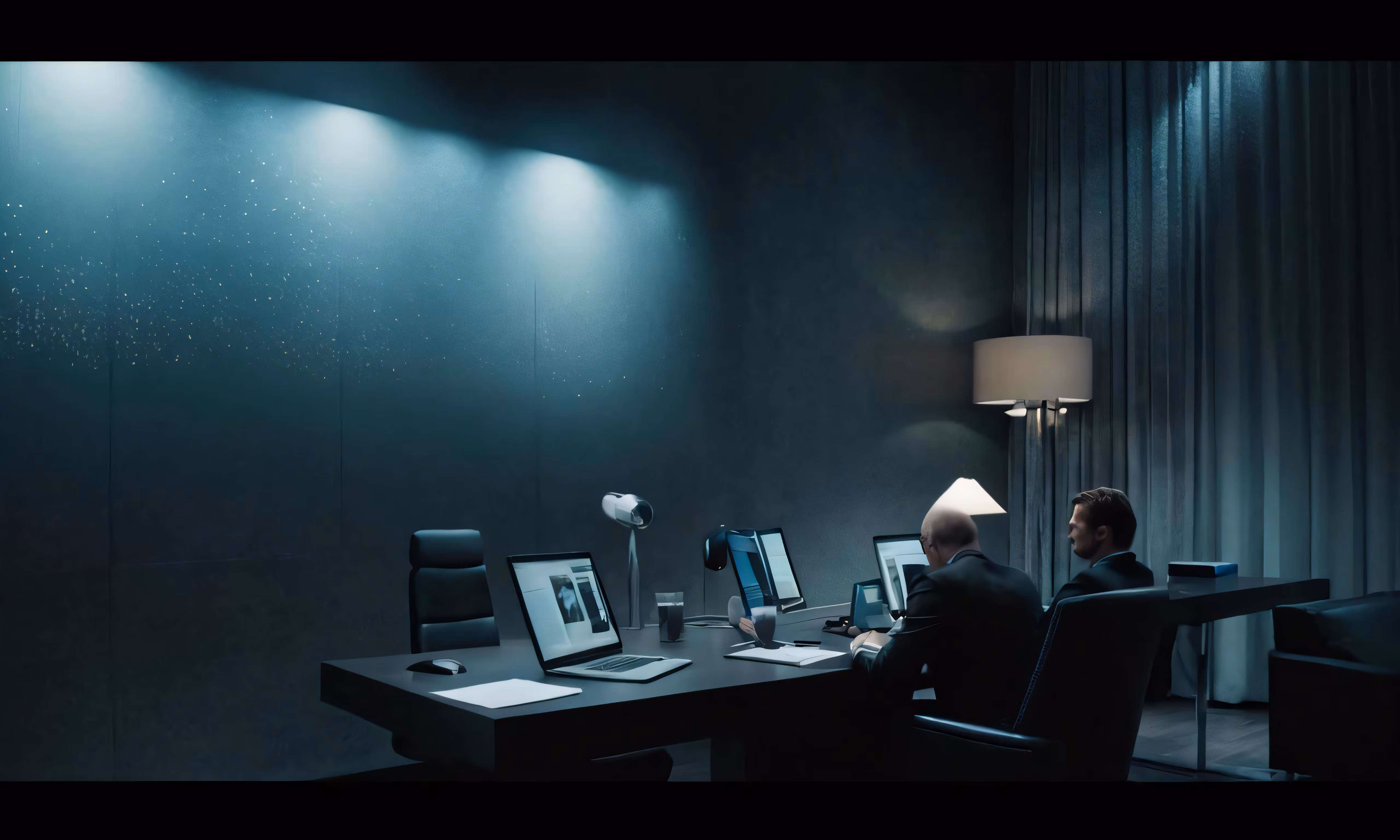 High resolution picture, free to use, the official logo for the 50 /two people sitting at a desk with computers in a darkened room