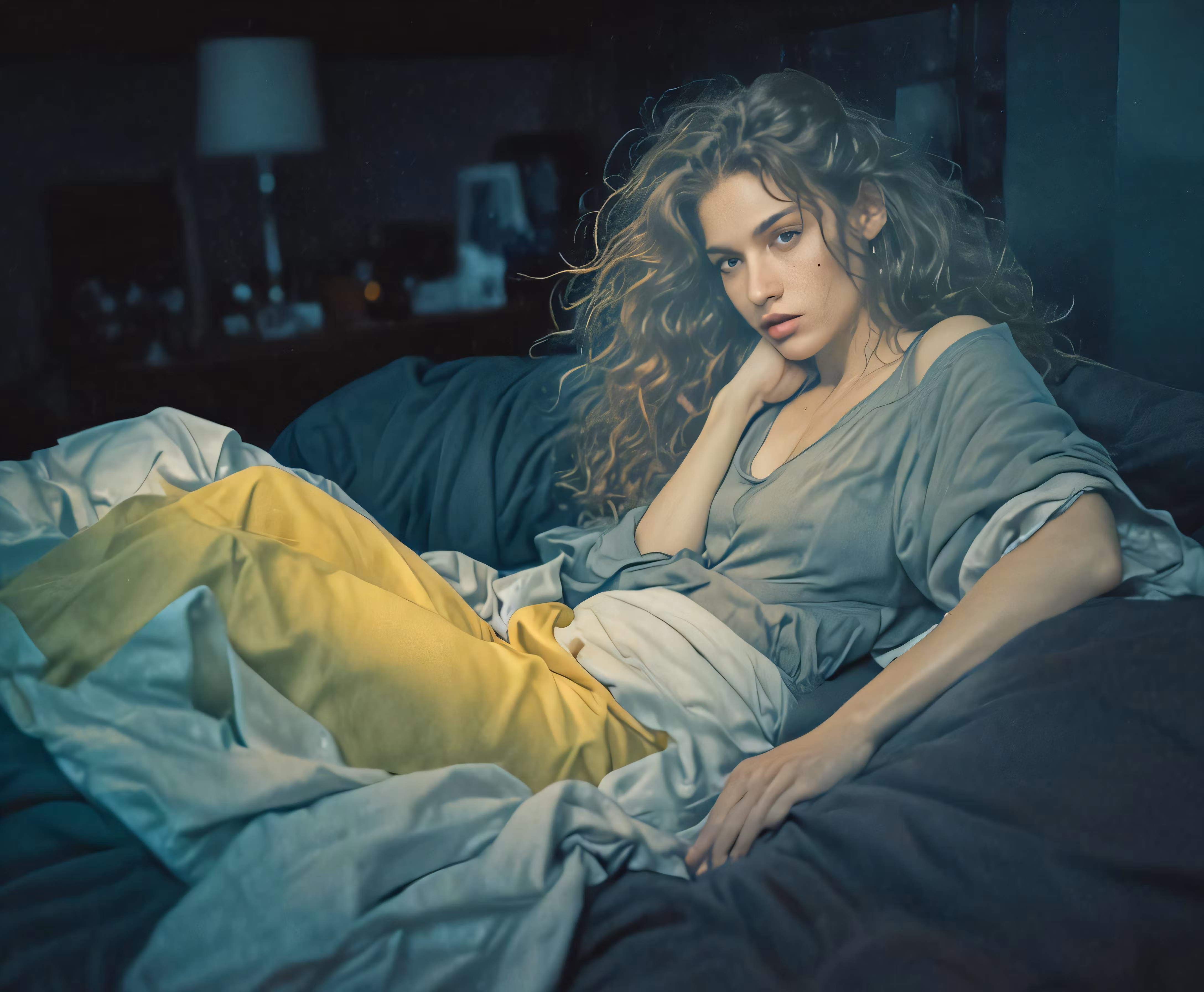 High resolution picture, free to use, the official logo for the 50 /woman laying in bed with pillow and blanket and looking up at camera