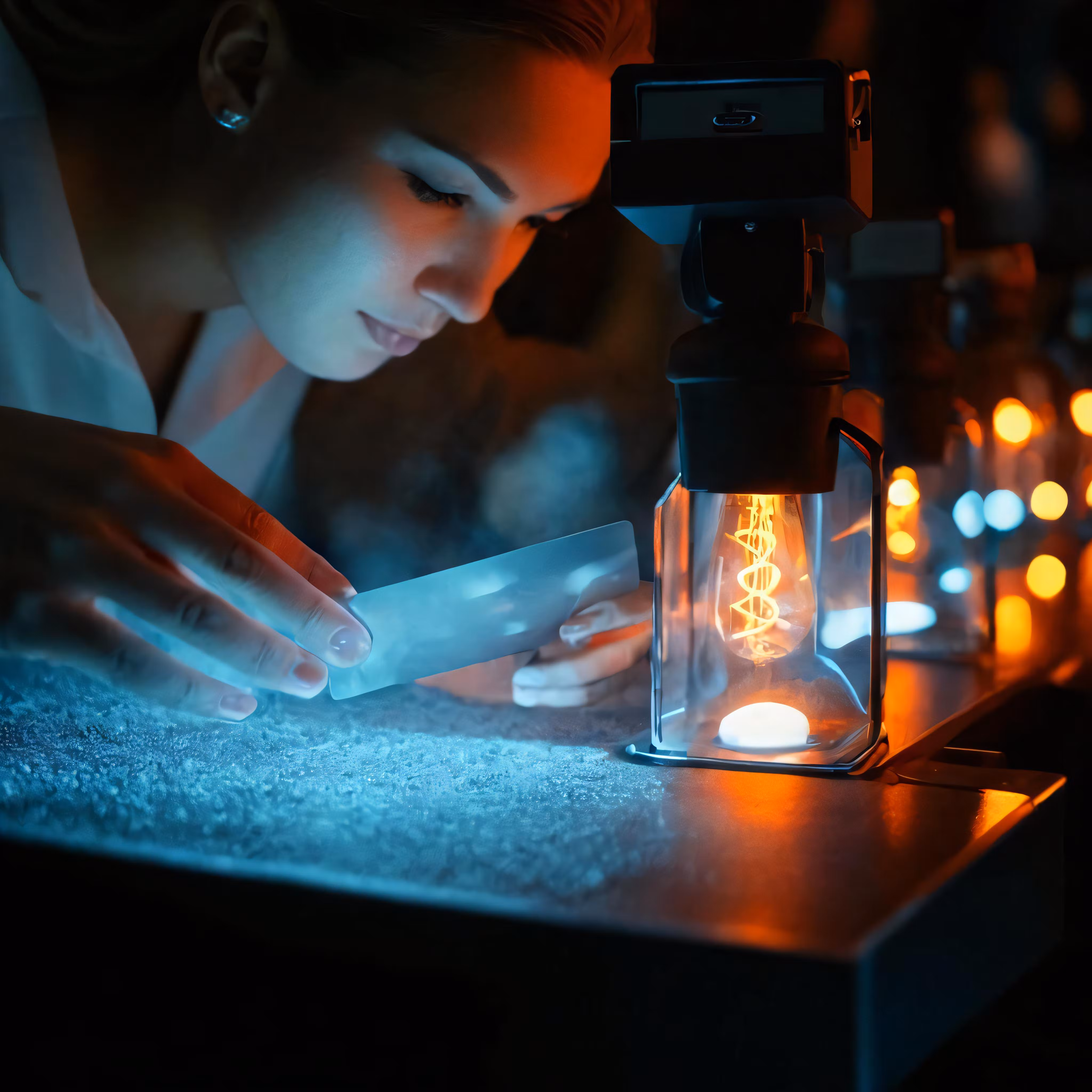 High resolution picture, free to use, the official logo for the 50 /woman looks at her cellphone under a lighted lantern