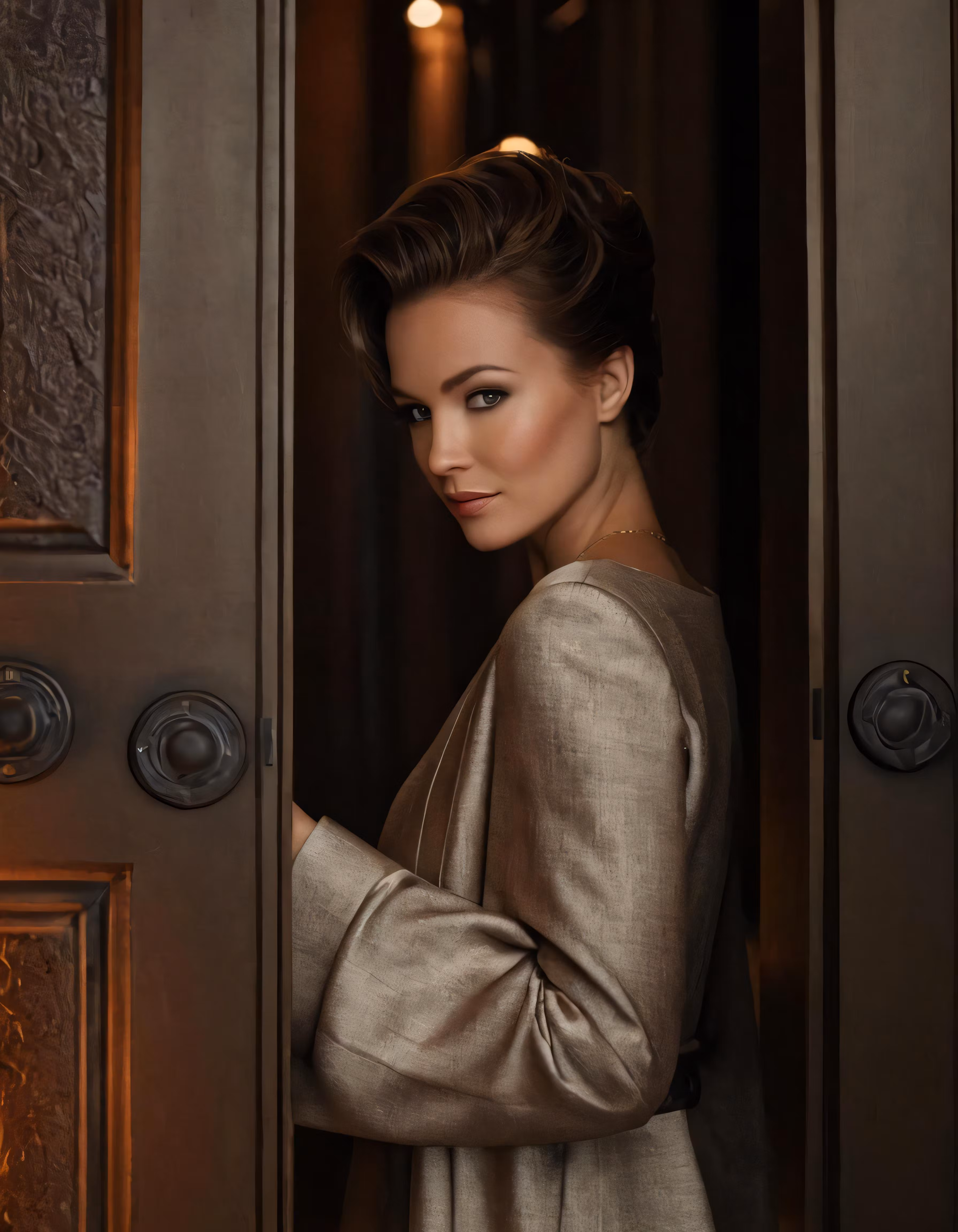 High resolution picture, free to use, the official logo for the 50 /woman wearing a silver dress, standing in an entrance with her hand on her chest