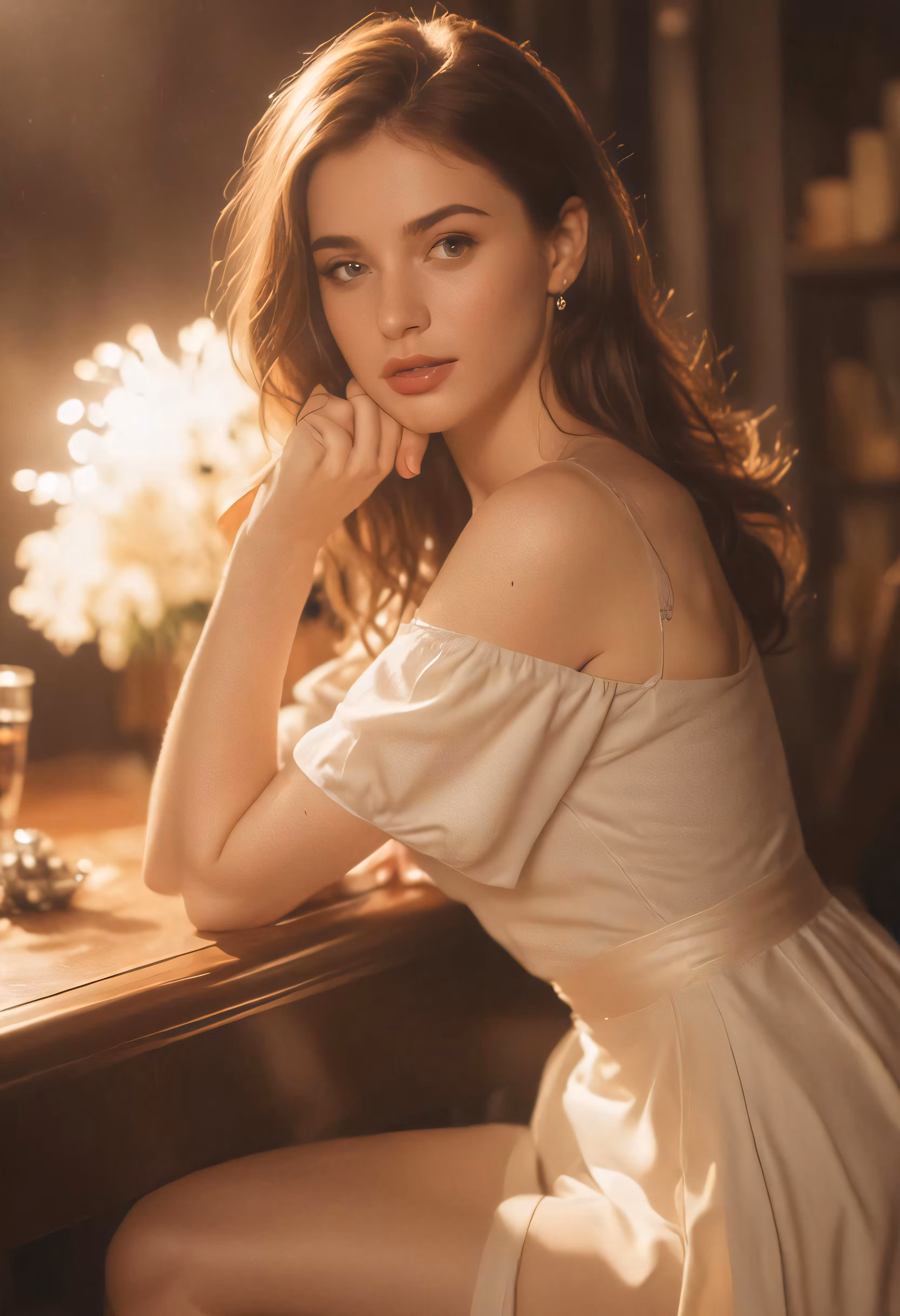 High resolution picture, free to use, the official logo for the 50 /young woman sitting at a bar in a white dress