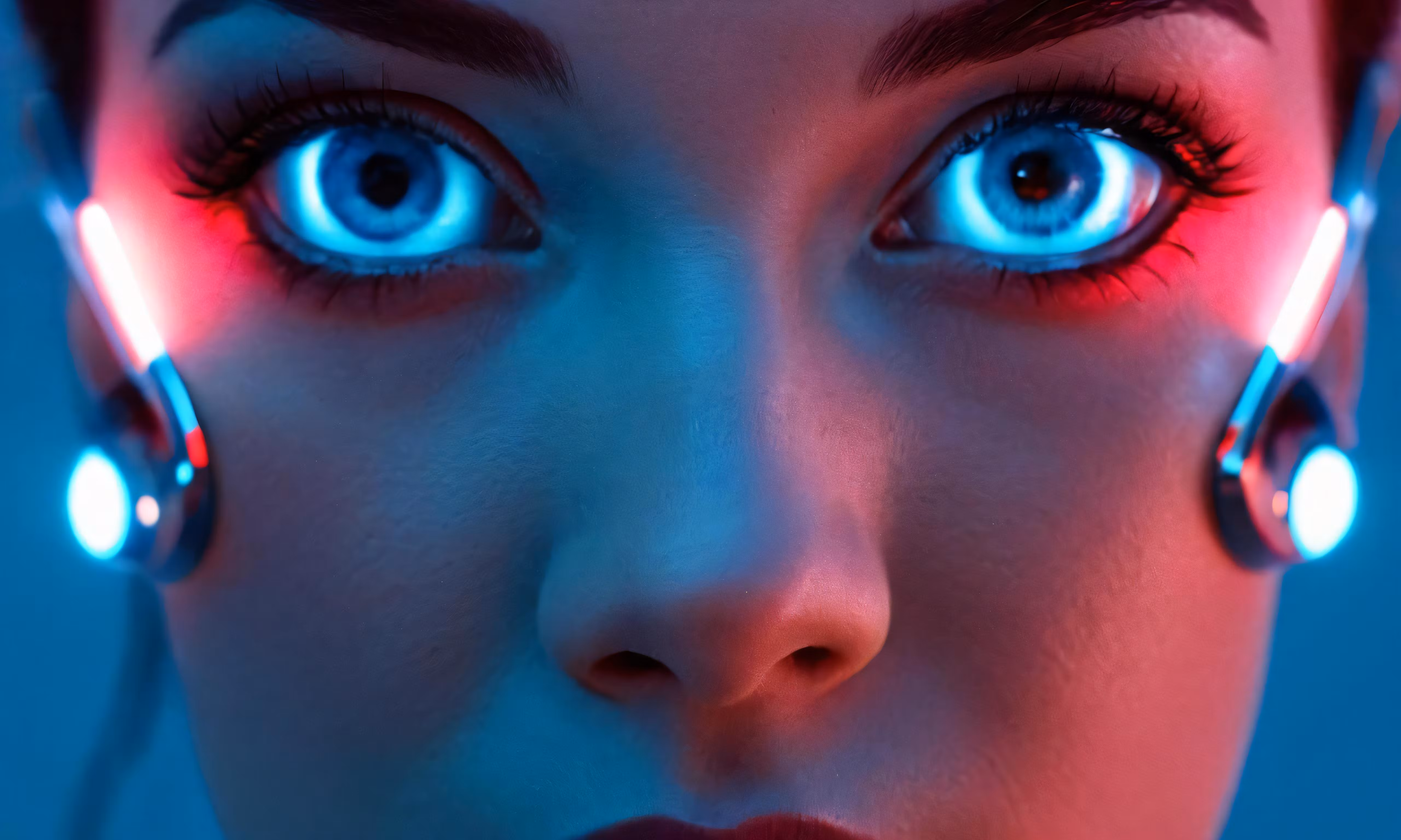 High resolution picture, free to use, the official logo for the 50 /young woman with bright blue eyes wearing headphones