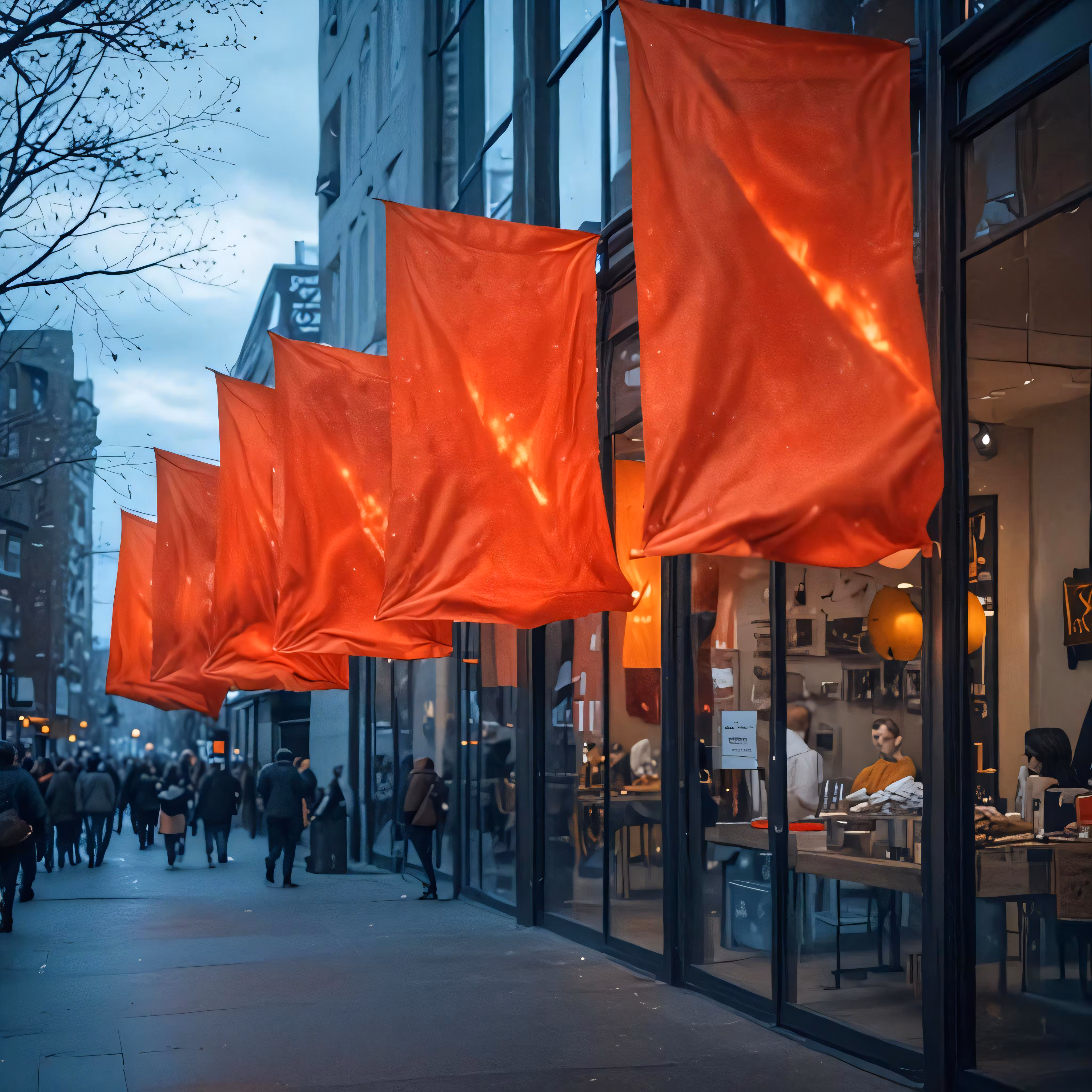 High resolution picture, free to use, the orange flags are hanging outside in a downtown area