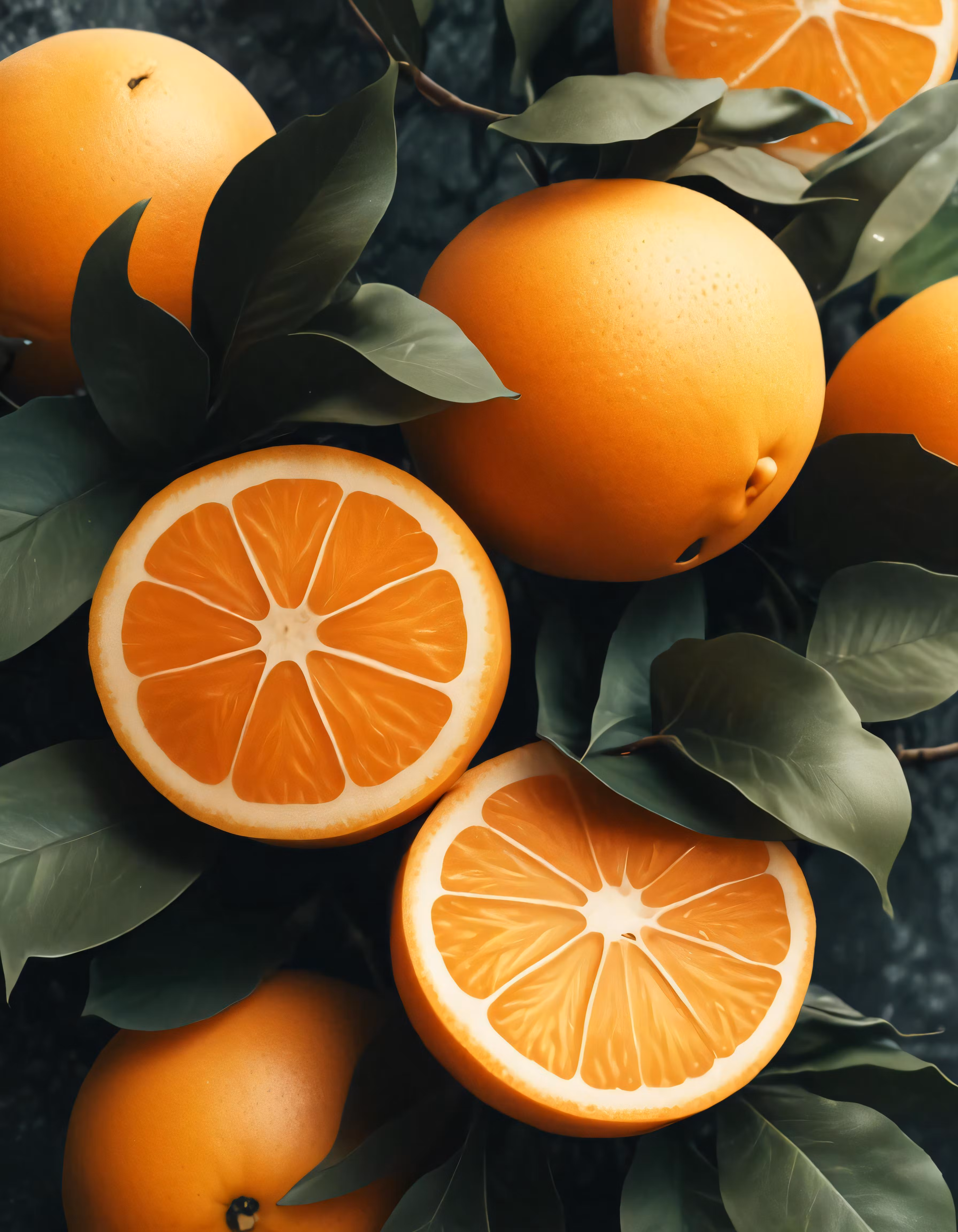 High resolution picture, free to use, the oranges are sliced and sitting on the tree