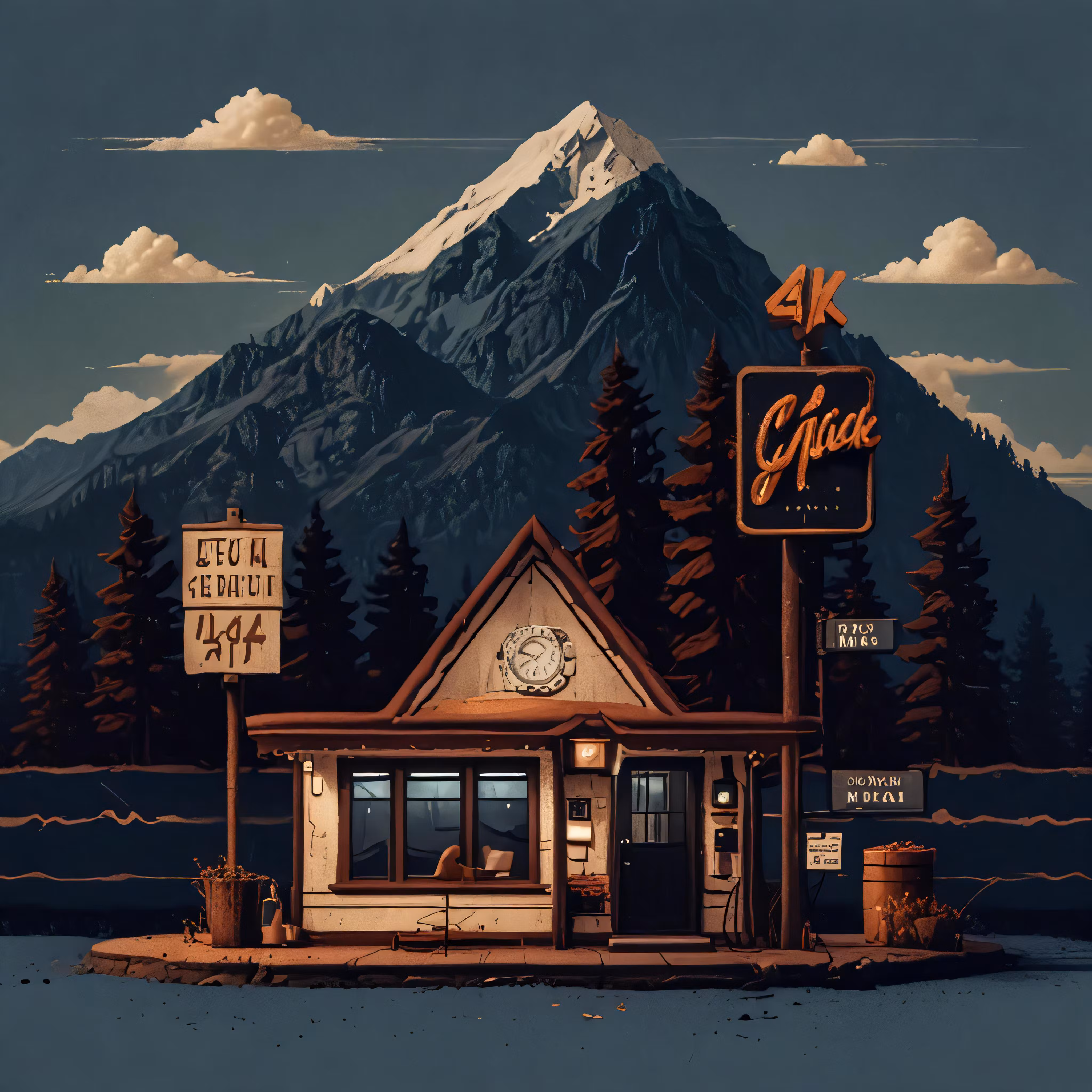 High resolution picture, free to use, the painting shows a lit   up restaurant with a mountain backdrop